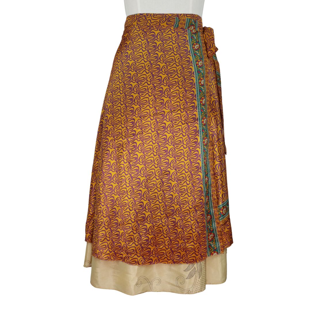 Traditionally Saris are often flamboyant and brightly coloured, frequently embroidered, and made from silk, cotton, or, in recent years, synthetic cloth such as viscose and polyester. We use retro Sari cloth in the majority of our garments so silk is a high component. It is not uncommon to find chiffon or georgette added into the mix which is why we refer to the skirts as a silk blend. We also use 'end of roll' sari fabrics.