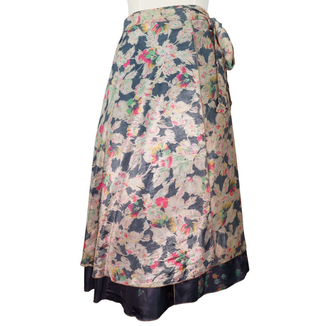 Traditionally Saris are often flamboyant and brightly coloured, frequently embroidered, and made from silk, cotton, or, in recent years, synthetic cloth such as viscose and polyester. We use retro Sari cloth in the majority of our garments so silk is a high component. It is not uncommon to find chiffon or georgette added into the mix which is why we refer to the skirts as a silk blend. We also use 'end of roll' sari fabrics.