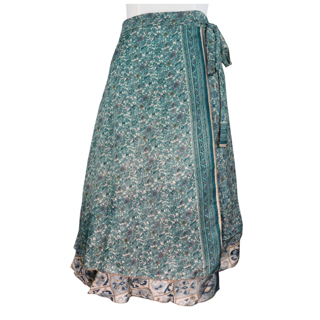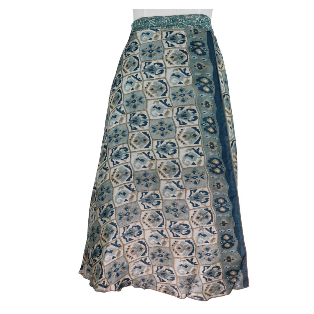 Traditionally Saris are often flamboyant and brightly coloured, frequently embroidered, and made from silk, cotton, or, in recent years, synthetic cloth such as viscose and polyester. We use retro Sari cloth in the majority of our garments so silk is a high component. It is not uncommon to find chiffon or georgette added into the mix which is why we refer to the skirts as a silk blend. We also use 'end of roll' sari fabrics.