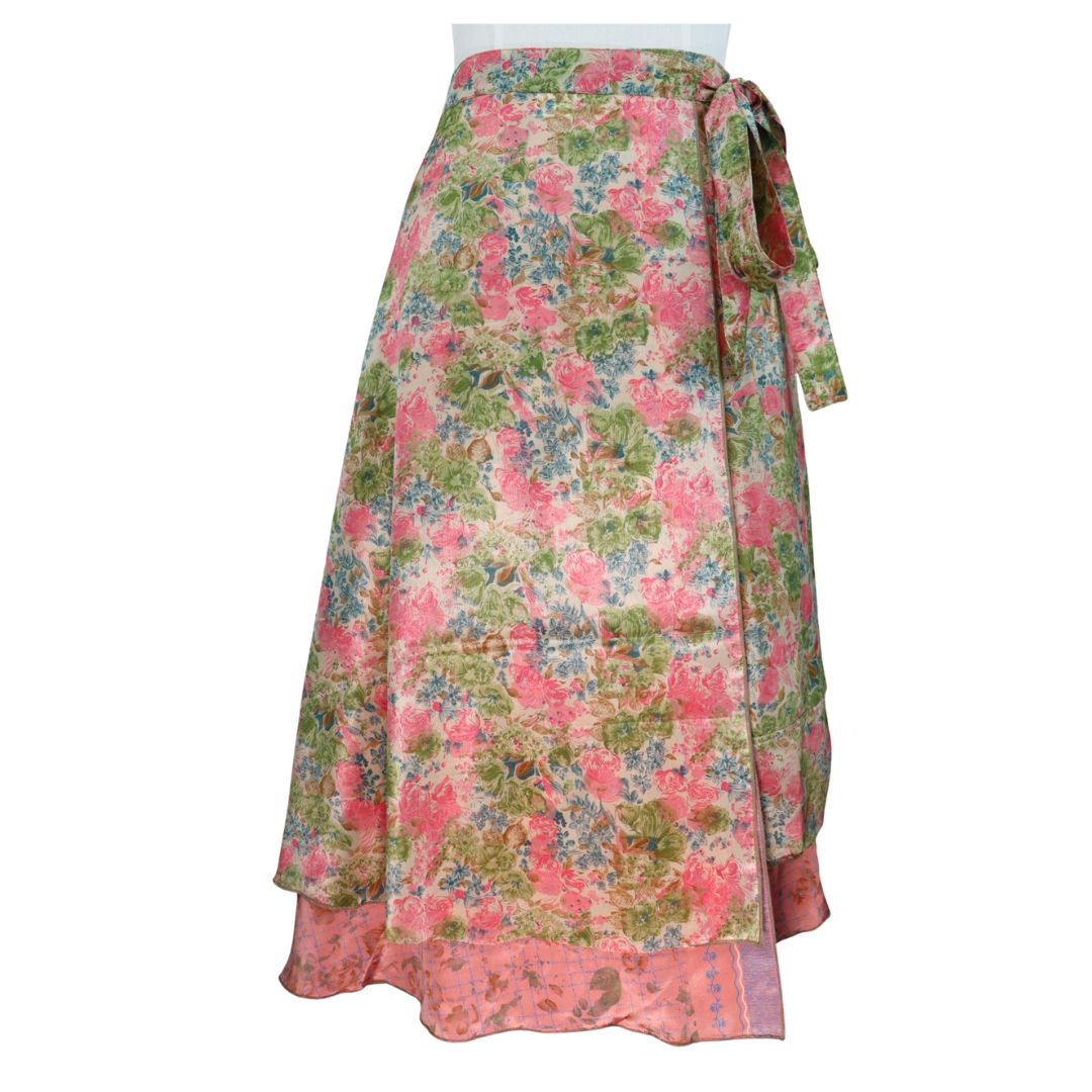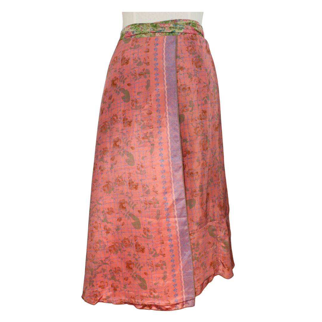 Traditionally Saris are often flamboyant and brightly coloured, frequently embroidered, and made from silk, cotton, or, in recent years, synthetic cloth such as viscose and polyester. We use retro Sari cloth in the majority of our garments so silk is a high component. It is not uncommon to find chiffon or georgette added into the mix which is why we refer to the skirts as a silk blend. We also use 'end of roll' sari fabrics.