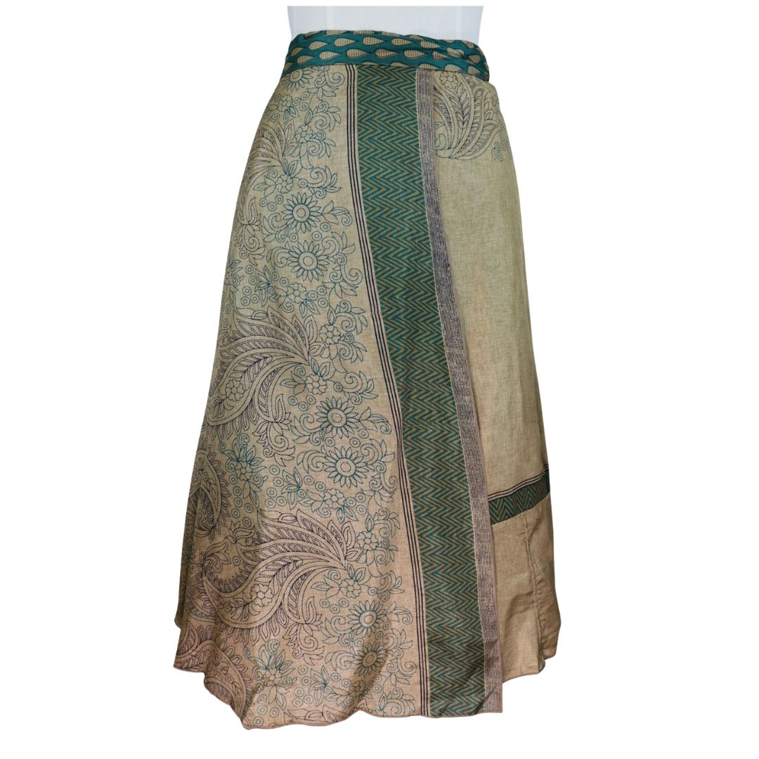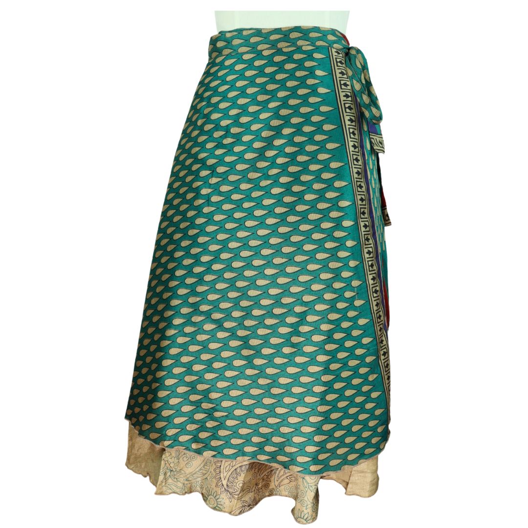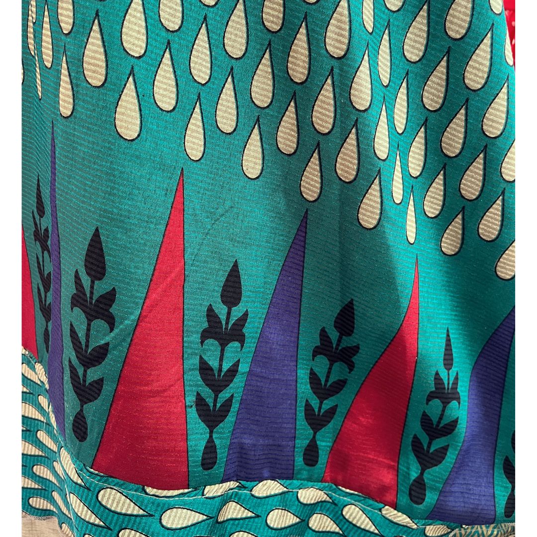 Traditionally Saris are often flamboyant and brightly coloured, frequently embroidered, and made from silk, cotton, or, in recent years, synthetic cloth such as viscose and polyester. We use retro Sari cloth in the majority of our garments so silk is a high component. It is not uncommon to find chiffon or georgette added into the mix which is why we refer to the skirts as a silk blend. We also use 'end of roll' sari fabrics.
