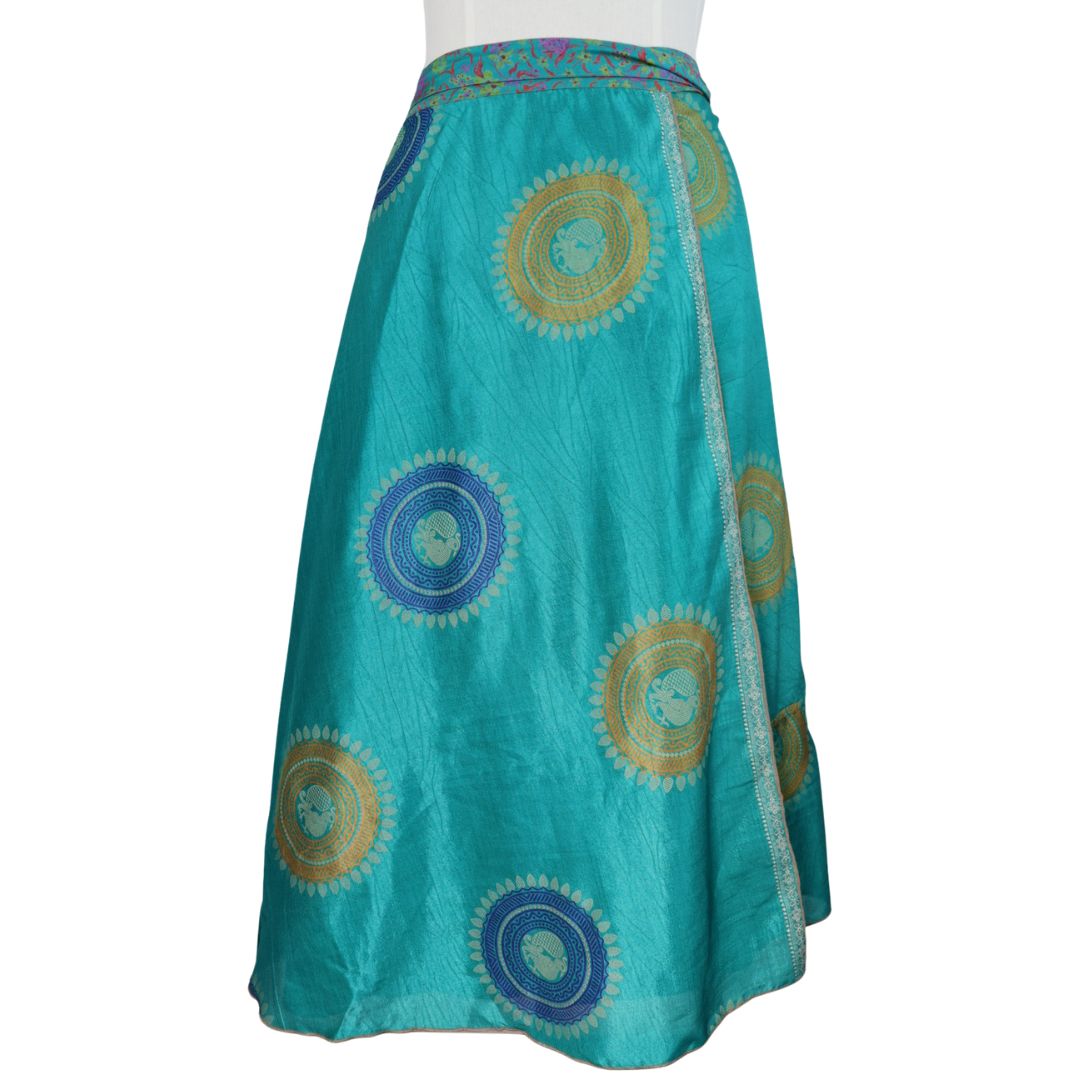 Traditionally Saris are often flamboyant and brightly coloured, frequently embroidered, and made from silk, cotton, or, in recent years, synthetic cloth such as viscose and polyester. We use retro Sari cloth in the majority of our garments so silk is a high component. It is not uncommon to find chiffon or georgette added into the mix which is why we refer to the skirts as a silk blend. We also use 'end of roll' sari fabrics.