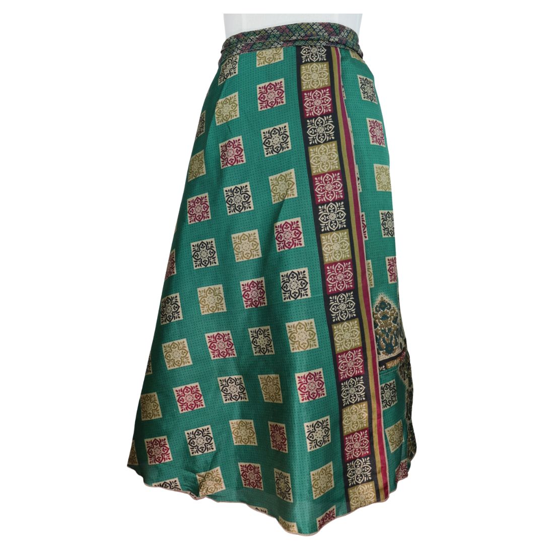 Traditionally Saris are often flamboyant and brightly coloured, frequently embroidered, and made from silk, cotton, or, in recent years, synthetic cloth such as viscose and polyester. We use retro Sari cloth in the majority of our garments so silk is a high component. It is not uncommon to find chiffon or georgette added into the mix which is why we refer to the skirts as a silk blend. We also use 'end of roll' sari fabrics.