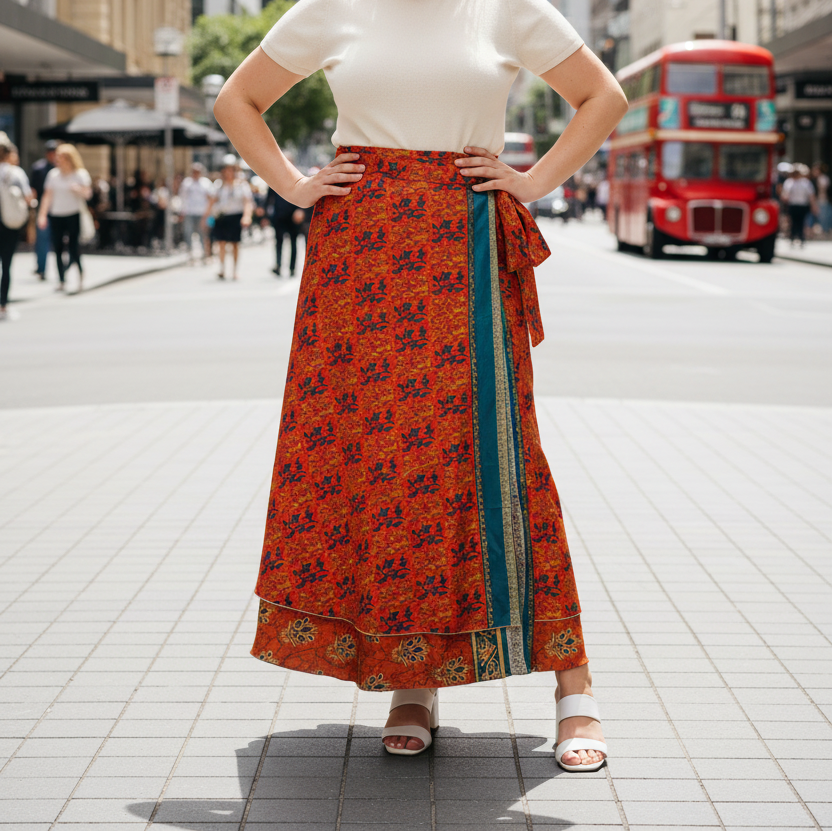Lovely wrap skirt. Beautiful colours. I have quite a few of these skirts now and just love the variety of colours and patterns they come in. Easy to wear, well made and they flow beautifully. Always top service from Amy and Ella with orders despatched promptly. Original garments made beautifully.