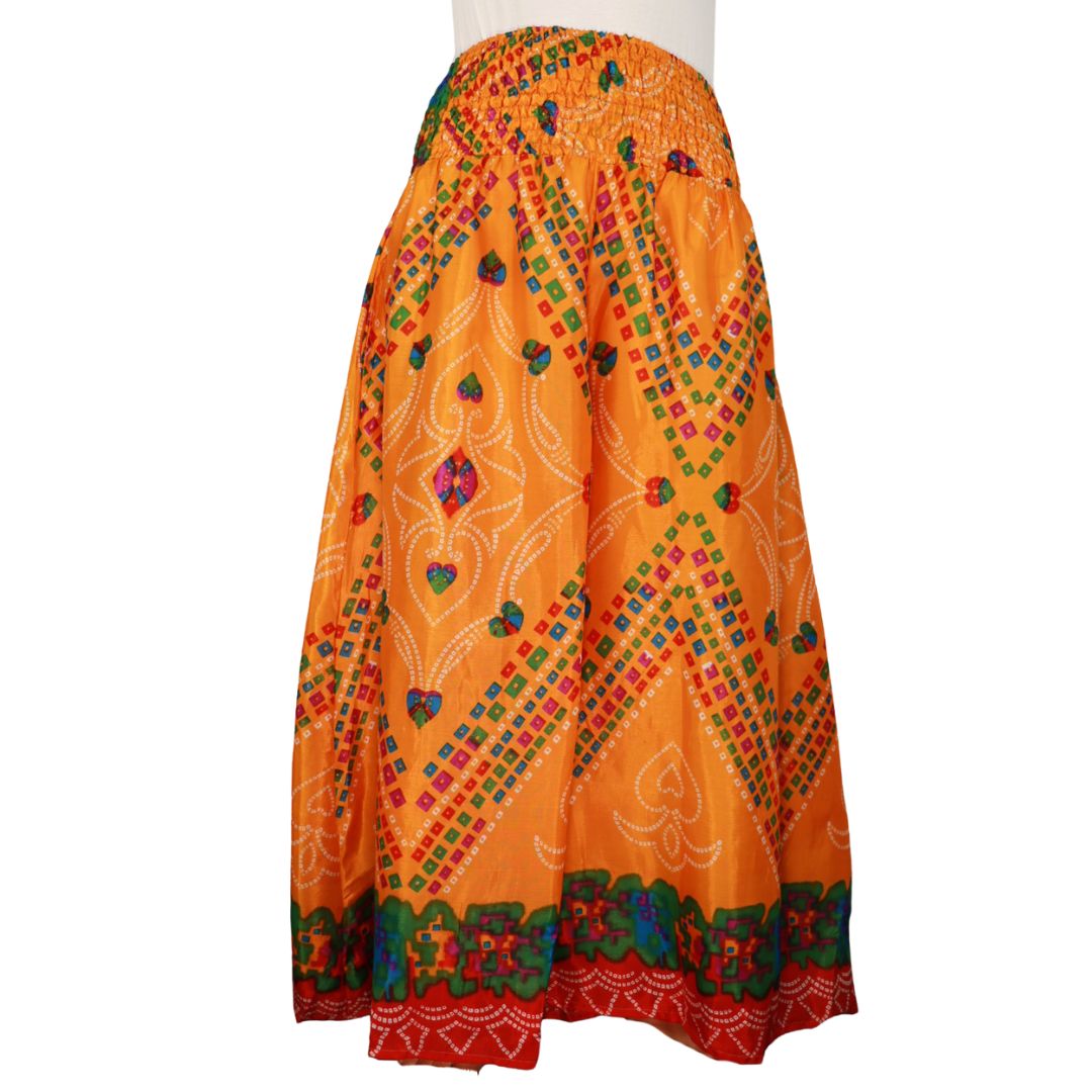 Traditionally Saris are often flamboyant and brightly coloured, frequently embroidered, and made from silk, cotton, or, in recent years, synthetic cloth such as viscose and polyester. We use retro Sari cloth in the majority of our garments so silk is a high component. It is not uncommon to find chiffon or georgette added into the mix which is why we refer to the skirts as a silk blend. We also use 'end of roll' sari fabrics.