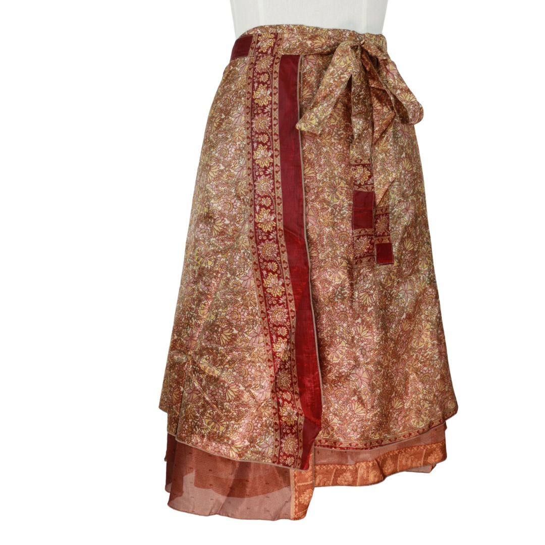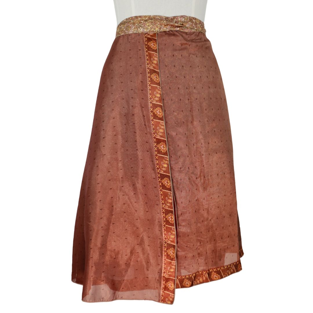 Traditionally Saris are often flamboyant and brightly coloured, frequently embroidered, and made from silk, cotton, or, in recent years, synthetic cloth such as viscose and polyester. We use retro Sari cloth in the majority of our garments so silk is a high component. It is not uncommon to find chiffon or georgette added into the mix which is why we refer to the skirts as a silk blend. We also use 'end of roll' sari fabrics.
