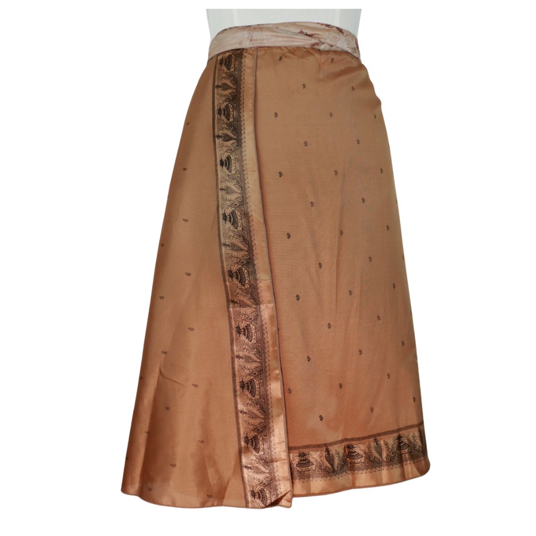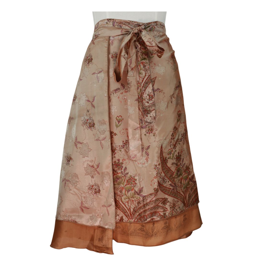 Traditionally Saris are often flamboyant and brightly coloured, frequently embroidered, and made from silk, cotton, or, in recent years, synthetic cloth such as viscose and polyester. We use retro Sari cloth in the majority of our garments so silk is a high component. It is not uncommon to find chiffon or georgette added into the mix which is why we refer to the skirts as a silk blend. We also use 'end of roll' sari fabrics.