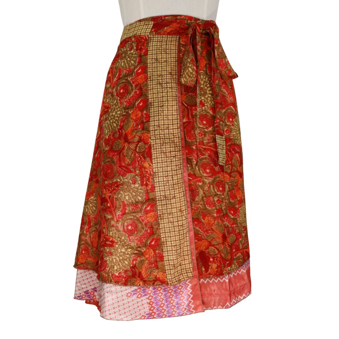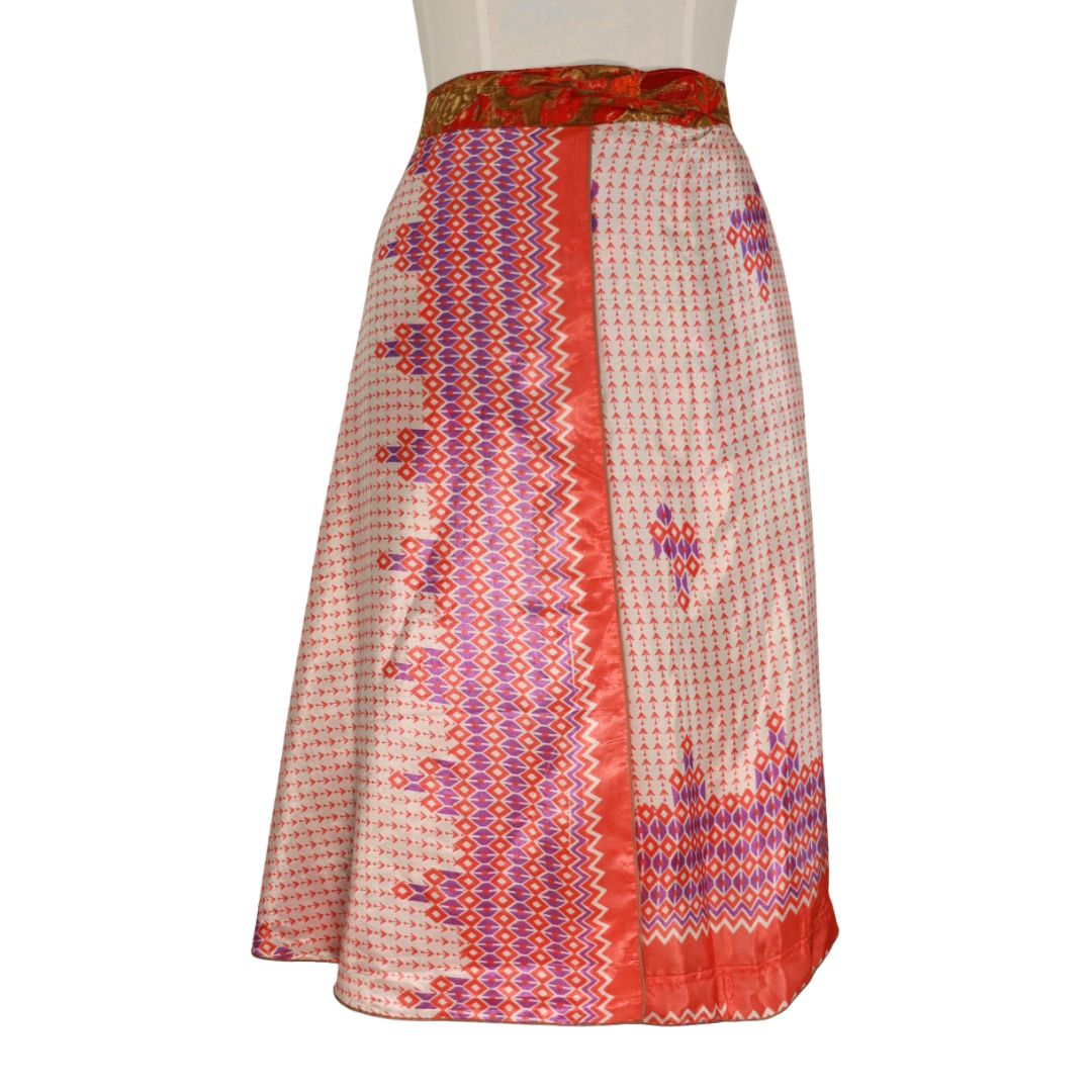 Traditionally Saris are often flamboyant and brightly coloured, frequently embroidered, and made from silk, cotton, or, in recent years, synthetic cloth such as viscose and polyester. We use retro Sari cloth in the majority of our garments so silk is a high component. It is not uncommon to find chiffon or georgette added into the mix which is why we refer to the skirts as a silk blend. We also use 'end of roll' sari fabrics.