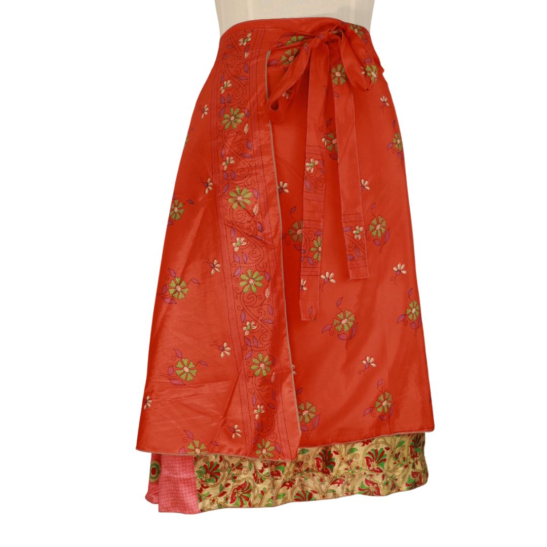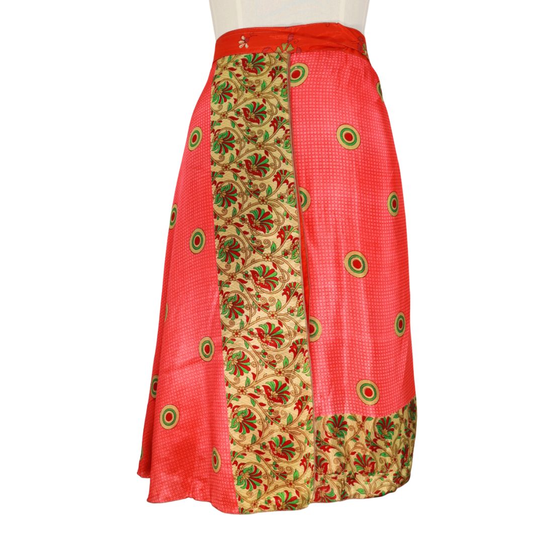 Traditionally Saris are often flamboyant and brightly coloured, frequently embroidered, and made from silk, cotton, or, in recent years, synthetic cloth such as viscose and polyester. We use retro Sari cloth in the majority of our garments so silk is a high component. It is not uncommon to find chiffon or georgette added into the mix which is why we refer to the skirts as a silk blend. We also use 'end of roll' sari fabrics.