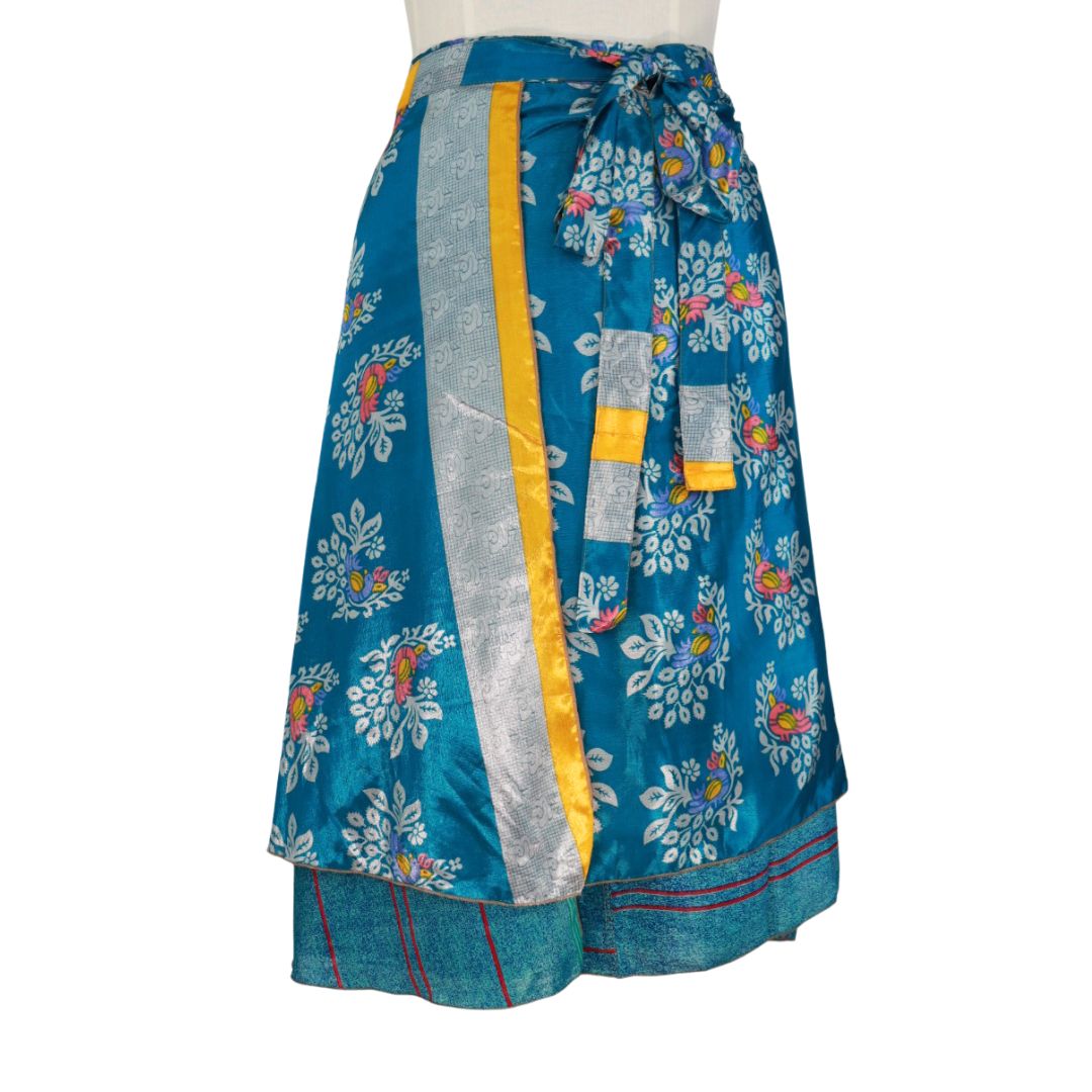 Traditionally Saris are often flamboyant and brightly coloured, frequently embroidered, and made from silk, cotton, or, in recent years, synthetic cloth such as viscose and polyester. We use retro Sari cloth in the majority of our garments so silk is a high component. It is not uncommon to find chiffon or georgette added into the mix which is why we refer to the skirts as a silk blend. We also use 'end of roll' sari fabrics.