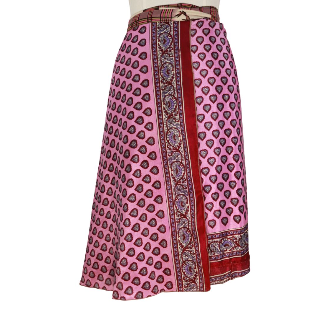Traditionally Saris are often flamboyant and brightly coloured, frequently embroidered, and made from silk, cotton, or, in recent years, synthetic cloth such as viscose and polyester. We use retro Sari cloth in the majority of our garments so silk is a high component. It is not uncommon to find chiffon or georgette added into the mix which is why we refer to the skirts as a silk blend. We also use 'end of roll' sari fabrics.