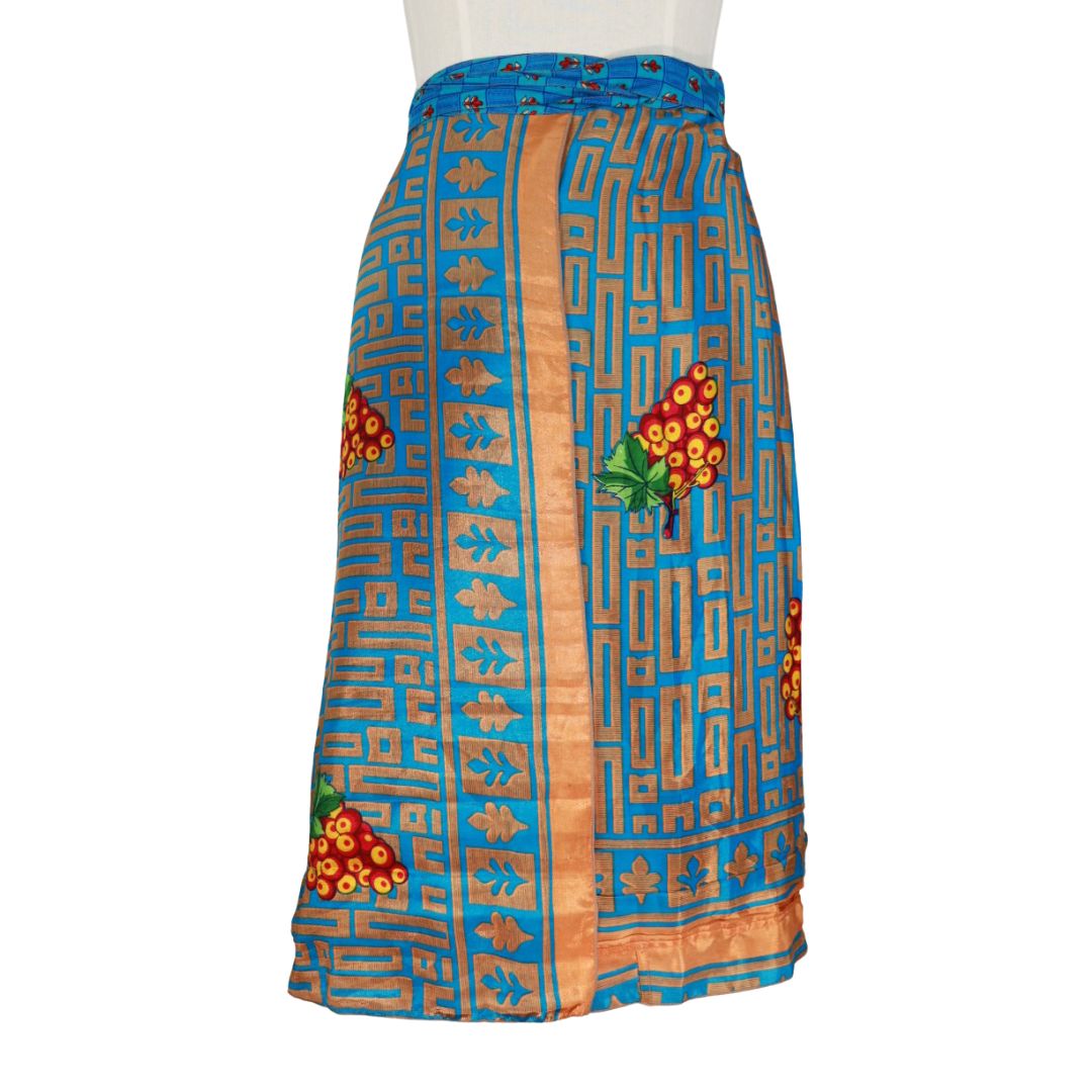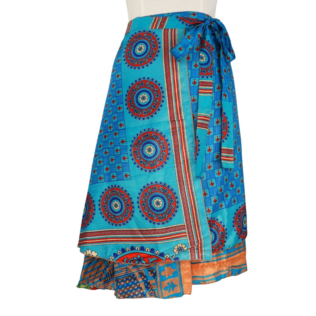 Traditionally Saris are often flamboyant and brightly coloured, frequently embroidered, and made from silk, cotton, or, in recent years, synthetic cloth such as viscose and polyester. We use retro Sari cloth in the majority of our garments so silk is a high component. It is not uncommon to find chiffon or georgette added into the mix which is why we refer to the skirts as a silk blend. We also use 'end of roll' sari fabrics.