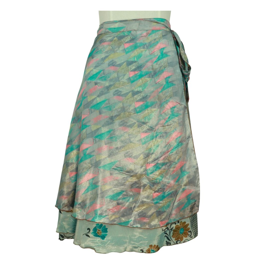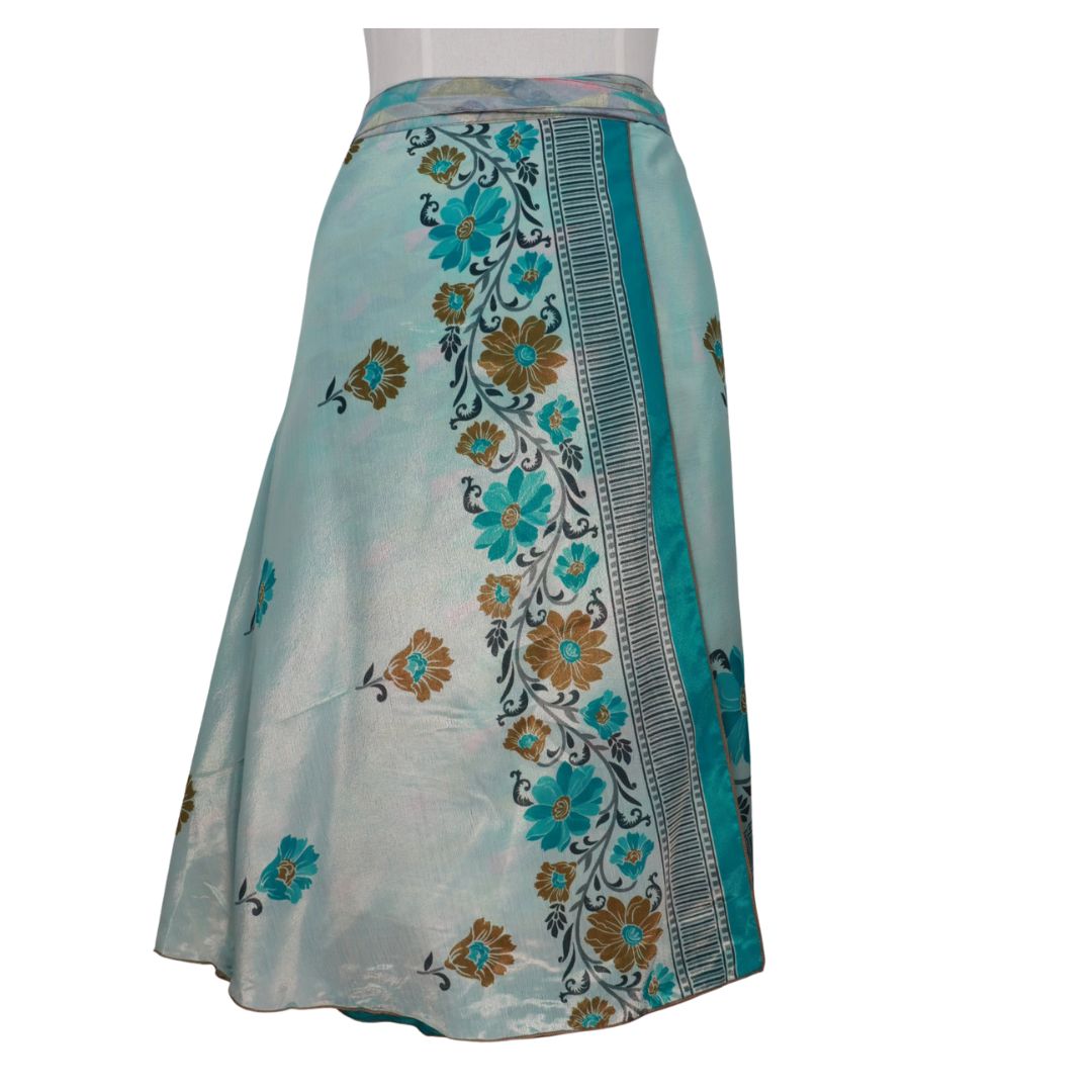Traditionally Saris are often flamboyant and brightly coloured, frequently embroidered, and made from silk, cotton, or, in recent years, synthetic cloth such as viscose and polyester. We use retro Sari cloth in the majority of our garments so silk is a high component. It is not uncommon to find chiffon or georgette added into the mix which is why we refer to the skirts as a silk blend. We also use 'end of roll' sari fabrics.