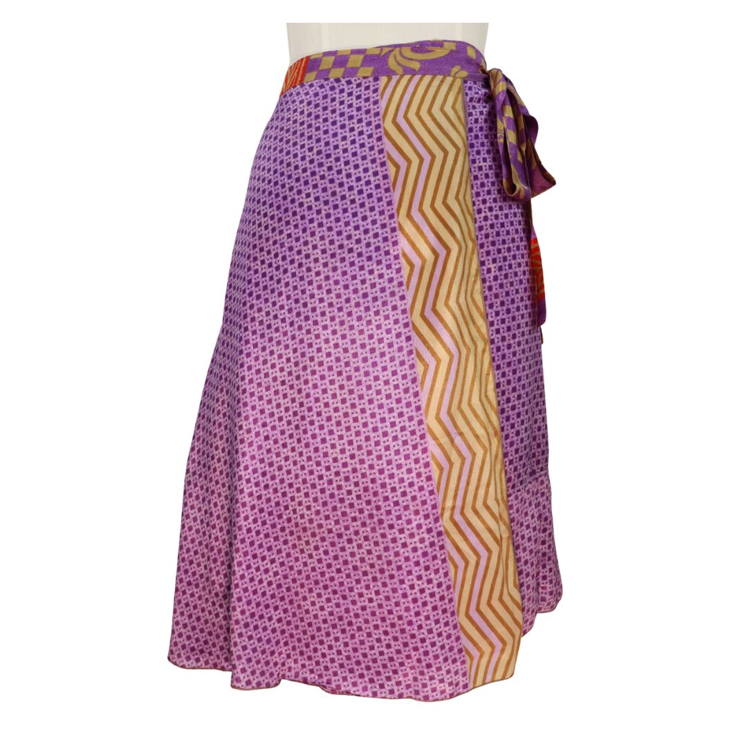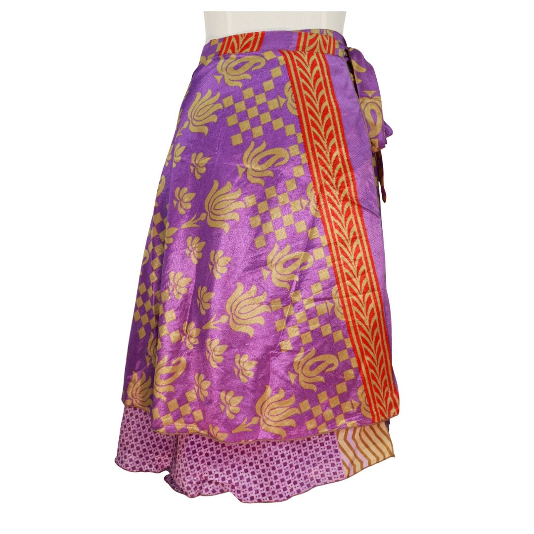 Traditionally Saris are often flamboyant and brightly coloured, frequently embroidered, and made from silk, cotton, or, in recent years, synthetic cloth such as viscose and polyester. We use retro Sari cloth in the majority of our garments so silk is a high component. It is not uncommon to find chiffon or georgette added into the mix which is why we refer to the skirts as a silk blend. We also use 'end of roll' sari fabrics.