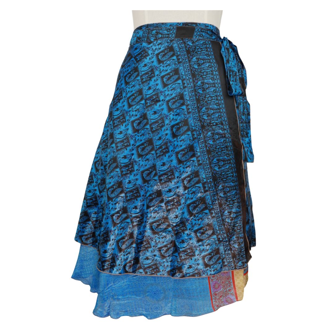 Traditionally Saris are often flamboyant and brightly coloured, frequently embroidered, and made from silk, cotton, or, in recent years, synthetic cloth such as viscose and polyester. We use retro Sari cloth in the majority of our garments so silk is a high component. It is not uncommon to find chiffon or georgette added into the mix which is why we refer to the skirts as a silk blend. We also use 'end of roll' sari fabrics.