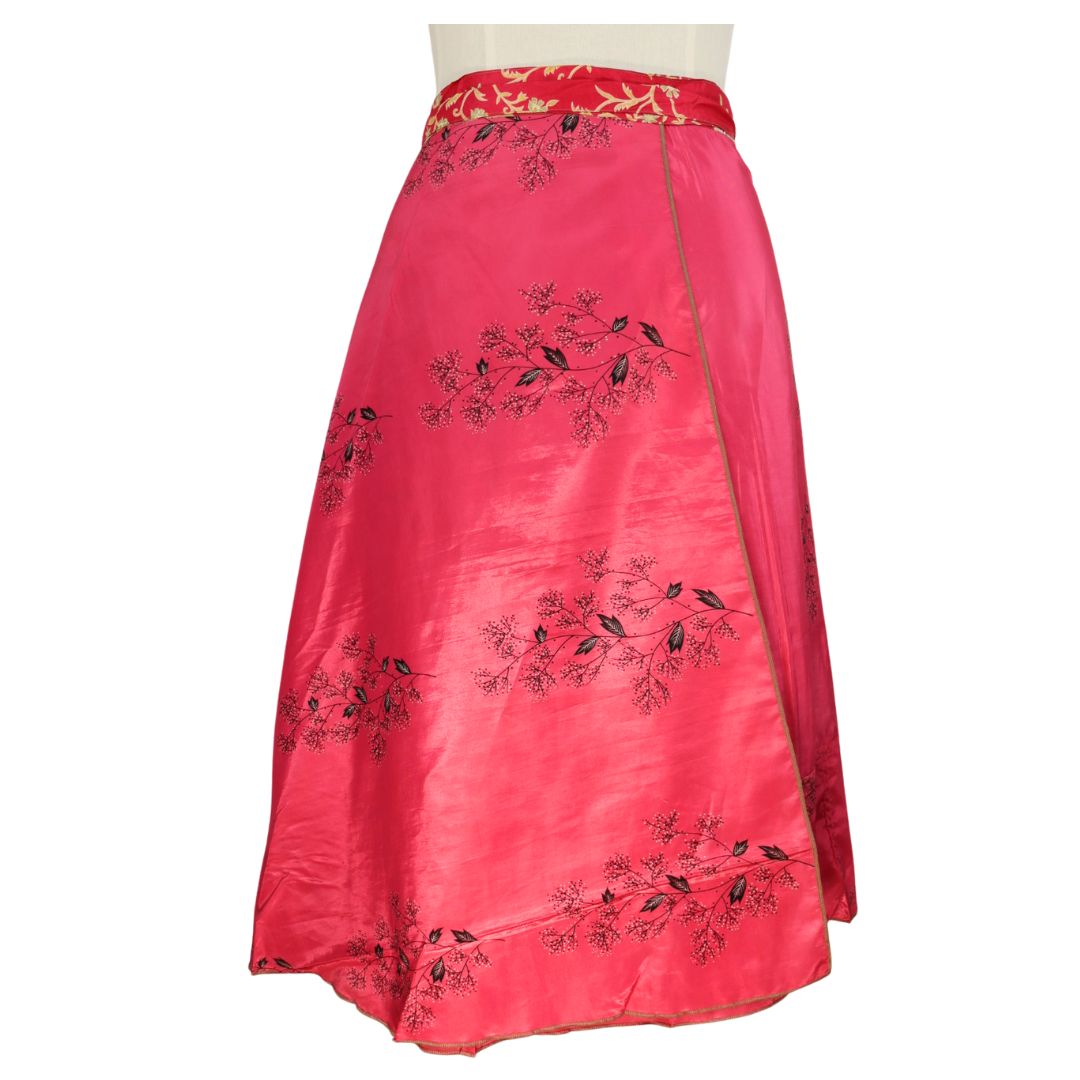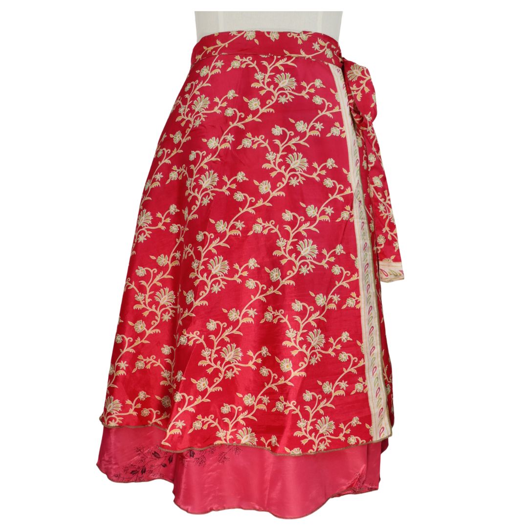 Traditionally Saris are often flamboyant and brightly coloured, frequently embroidered, and made from silk, cotton, or, in recent years, synthetic cloth such as viscose and polyester. We use retro Sari cloth in the majority of our garments so silk is a high component. It is not uncommon to find chiffon or georgette added into the mix which is why we refer to the skirts as a silk blend. We also use 'end of roll' sari fabrics.