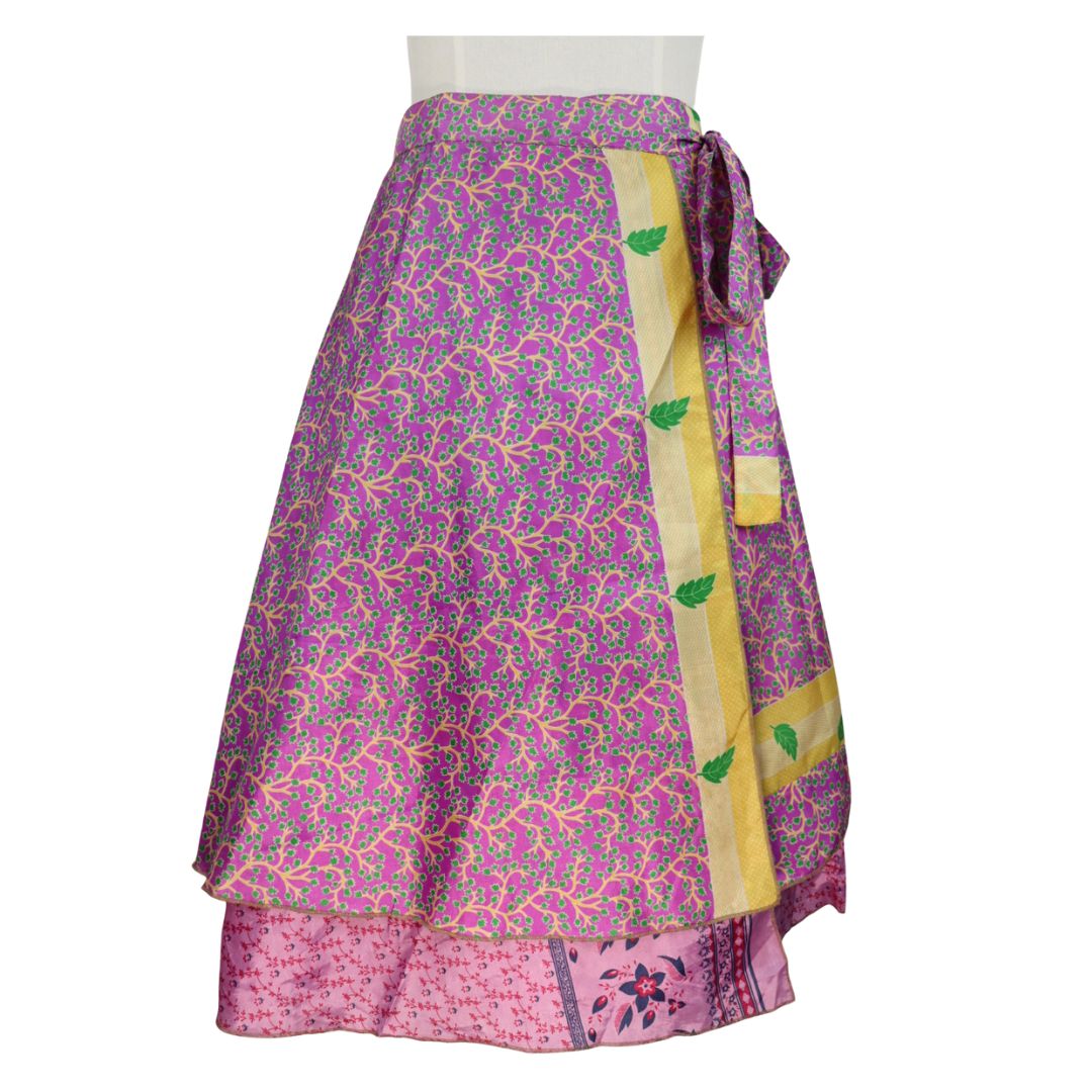 Traditionally Saris are often flamboyant and brightly coloured, frequently embroidered, and made from silk, cotton, or, in recent years, synthetic cloth such as viscose and polyester. We use retro Sari cloth in the majority of our garments so silk is a high component. It is not uncommon to find chiffon or georgette added into the mix which is why we refer to the skirts as a silk blend. We also use 'end of roll' sari fabrics.
