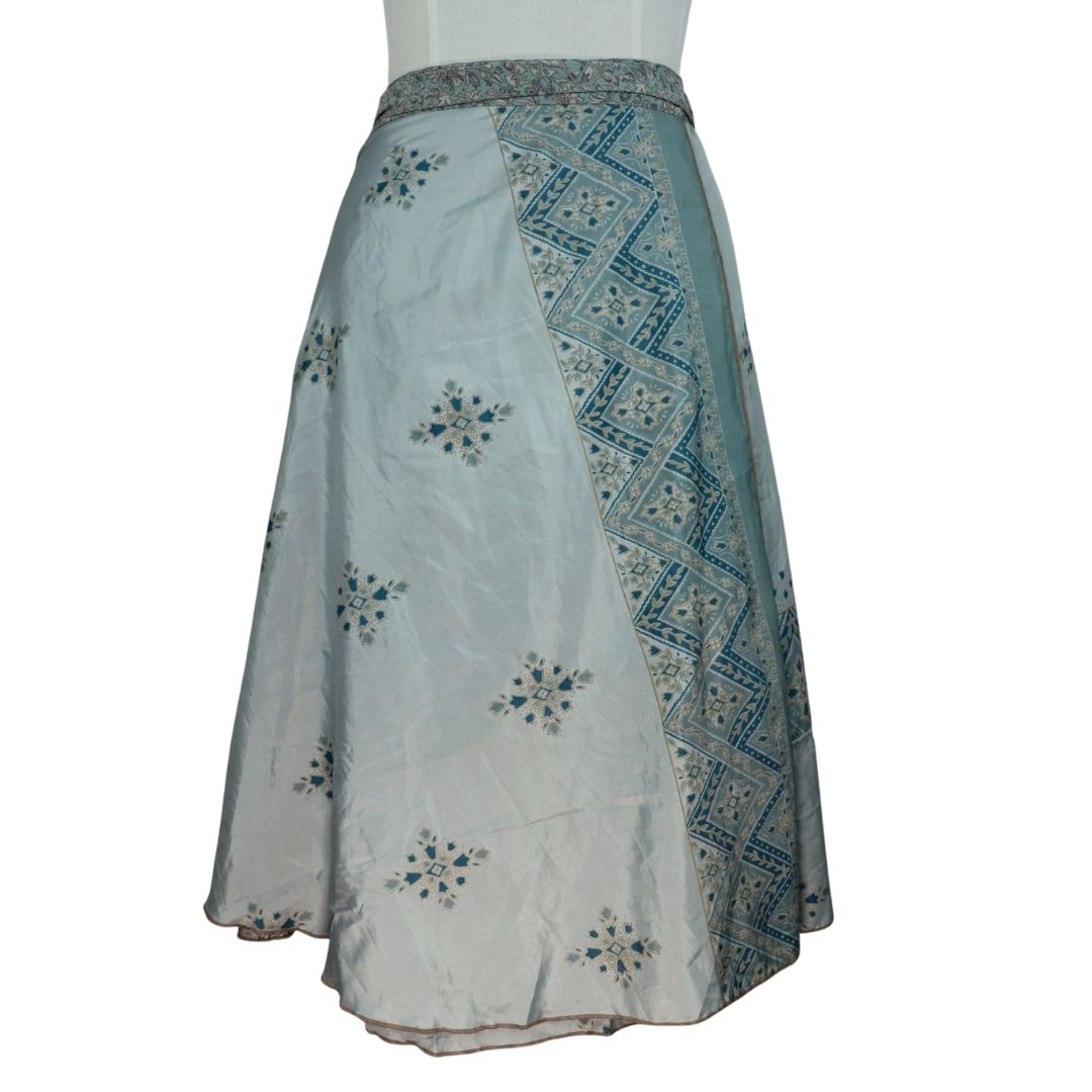 Traditionally Saris are often flamboyant and brightly coloured, frequently embroidered, and made from silk, cotton, or, in recent years, synthetic cloth such as viscose and polyester. We use retro Sari cloth in the majority of our garments so silk is a high component. It is not uncommon to find chiffon or georgette added into the mix which is why we refer to the skirts as a silk blend. We also use 'end of roll' sari fabrics.