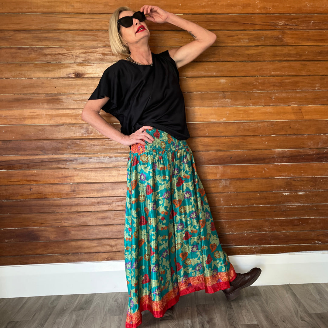 Traditionally Saris are often flamboyant and brightly coloured, frequently embroidered, and made from silk, cotton, or, in recent years, synthetic cloth such as viscose and polyester. We use retro Sari cloth in the majority of our garments so silk is a high component. It is not uncommon to find chiffon or georgette added into the mix which is why we refer to the skirts as a silk blend. We also use 'end of roll' sari fabrics.