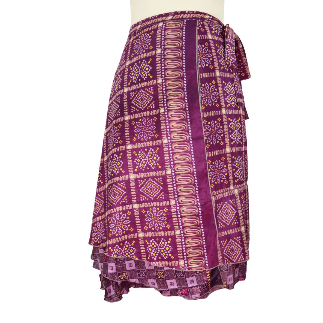 Traditionally Saris are often flamboyant and brightly coloured, frequently embroidered, and made from silk, cotton, or, in recent years, synthetic cloth such as viscose and polyester. We use retro Sari cloth in the majority of our garments so silk is a high component. It is not uncommon to find chiffon or georgette added into the mix which is why we refer to the skirts as a silk blend. We also use 'end of roll' sari fabrics.