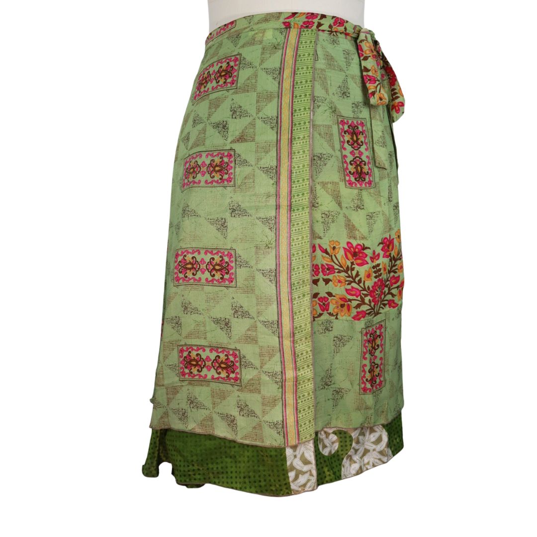 Traditionally Saris are often flamboyant and brightly coloured, frequently embroidered, and made from silk, cotton, or, in recent years, synthetic cloth such as viscose and polyester. We use retro Sari cloth in the majority of our garments so silk is a high component. It is not uncommon to find chiffon or georgette added into the mix which is why we refer to the skirts as a silk blend. We also use 'end of roll' sari fabrics.