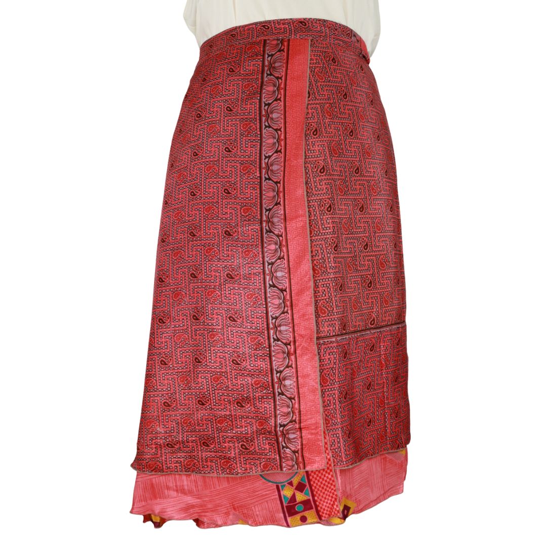 Traditionally Saris are often flamboyant and brightly coloured, frequently embroidered, and made from silk, cotton, or, in recent years, synthetic cloth such as viscose and polyester. We use retro Sari cloth in the majority of our garments so silk is a high component. It is not uncommon to find chiffon or georgette added into the mix which is why we refer to the skirts as a silk blend. We also use 'end of roll' sari fabrics.