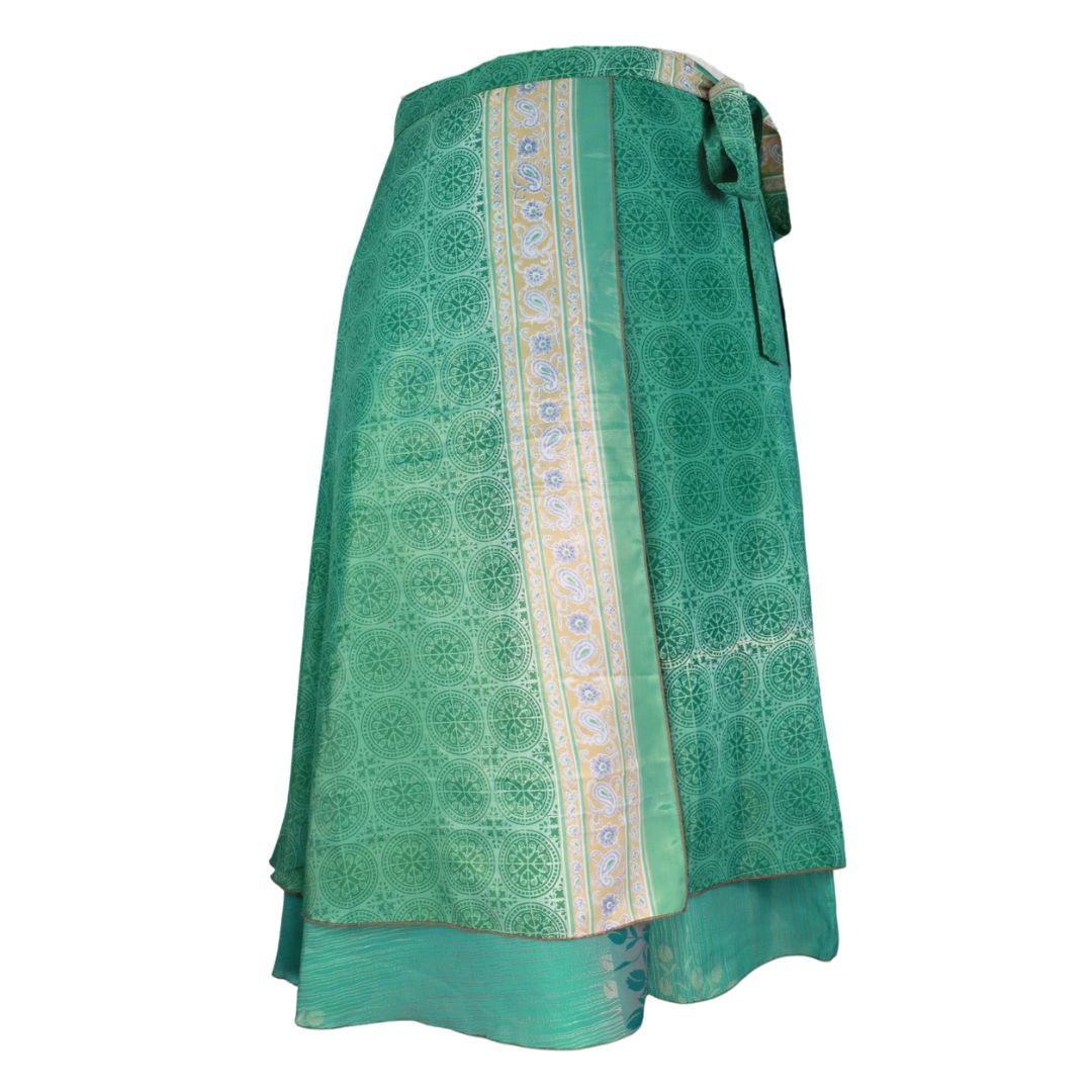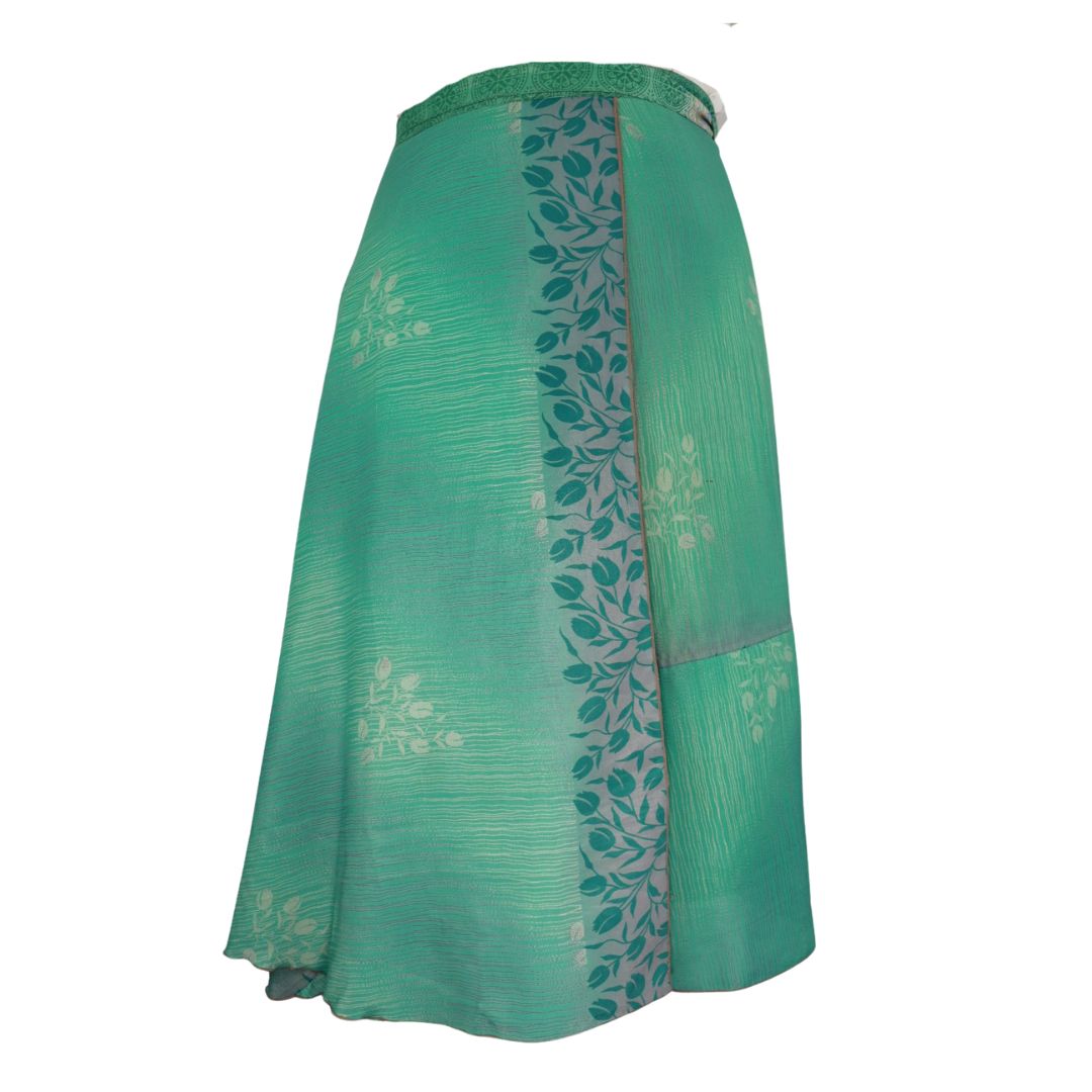 Traditionally Saris are often flamboyant and brightly coloured, frequently embroidered, and made from silk, cotton, or, in recent years, synthetic cloth such as viscose and polyester. We use retro Sari cloth in the majority of our garments so silk is a high component. It is not uncommon to find chiffon or georgette added into the mix which is why we refer to the skirts as a silk blend. We also use 'end of roll' sari fabrics.