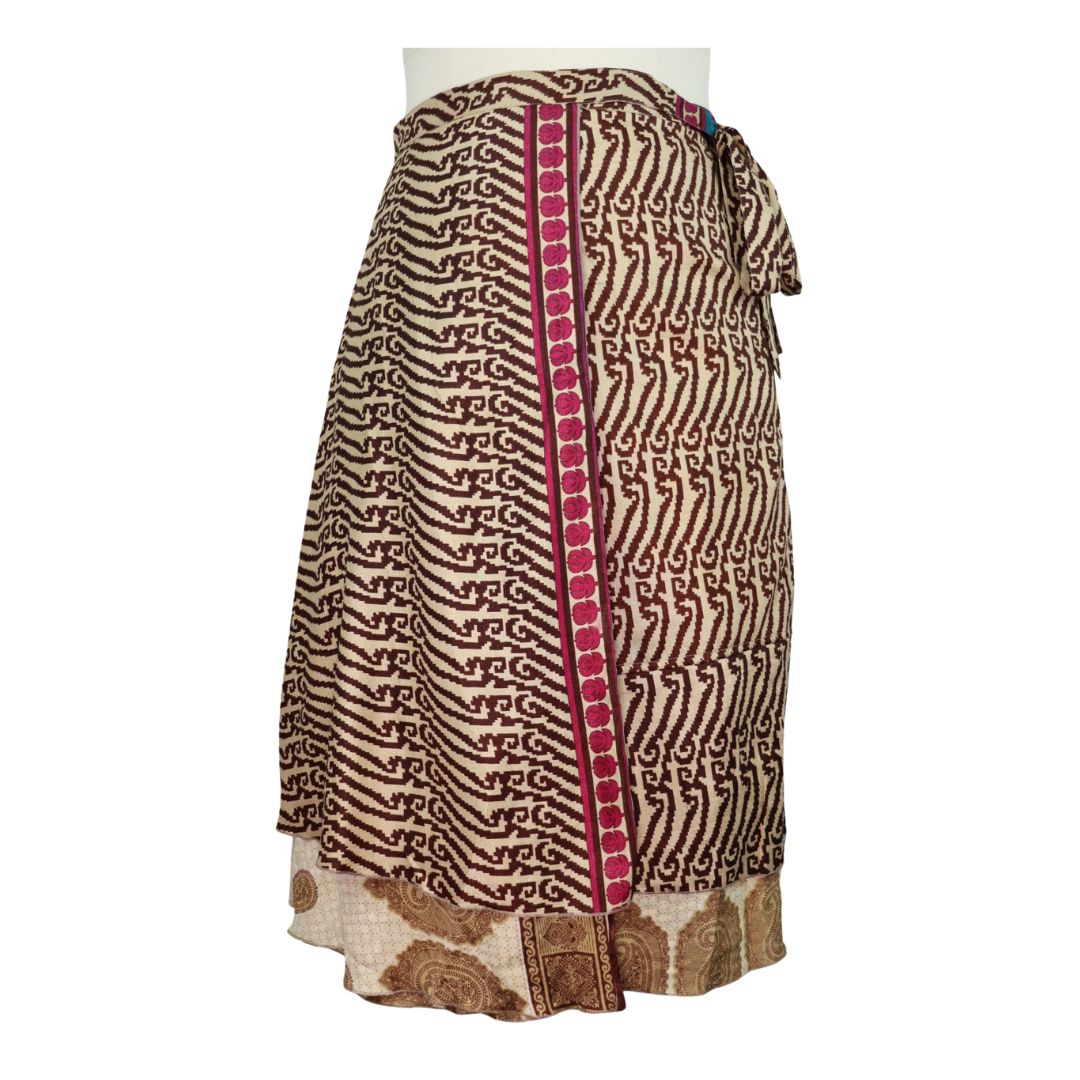 Traditionally Saris are often flamboyant and brightly coloured, frequently embroidered, and made from silk, cotton, or, in recent years, synthetic cloth such as viscose and polyester. We use retro Sari cloth in the majority of our garments so silk is a high component. It is not uncommon to find chiffon or georgette added into the mix which is why we refer to the skirts as a silk blend. We also use 'end of roll' sari fabrics.