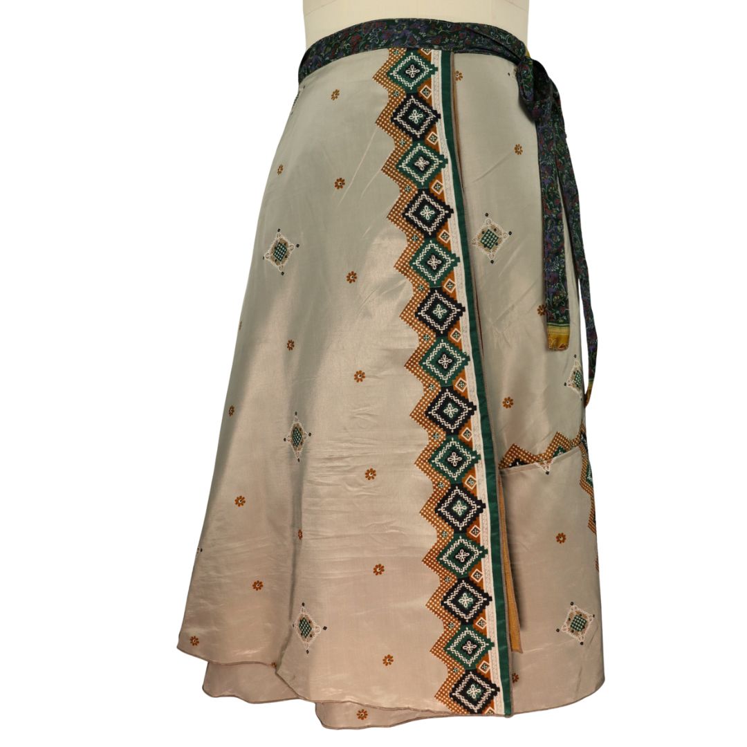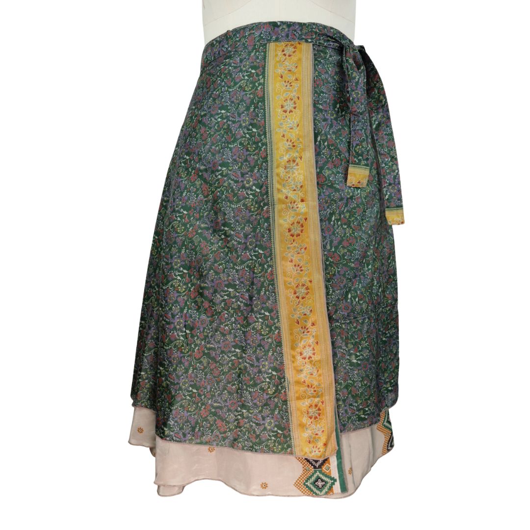 Traditionally Saris are often flamboyant and brightly coloured, frequently embroidered, and made from silk, cotton, or, in recent years, synthetic cloth such as viscose and polyester. We use retro Sari cloth in the majority of our garments so silk is a high component. It is not uncommon to find chiffon or georgette added into the mix which is why we refer to the skirts as a silk blend. We also use 'end of roll' sari fabrics.