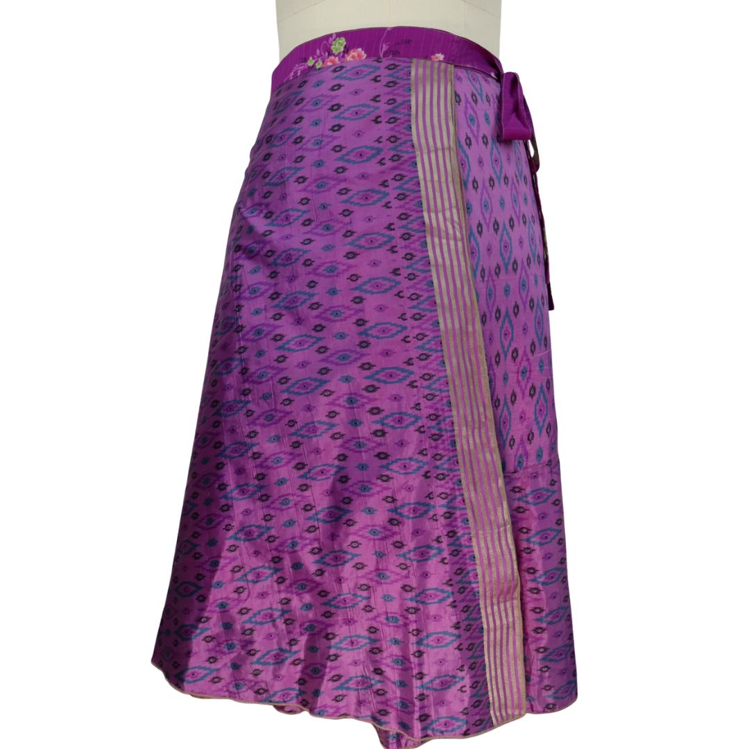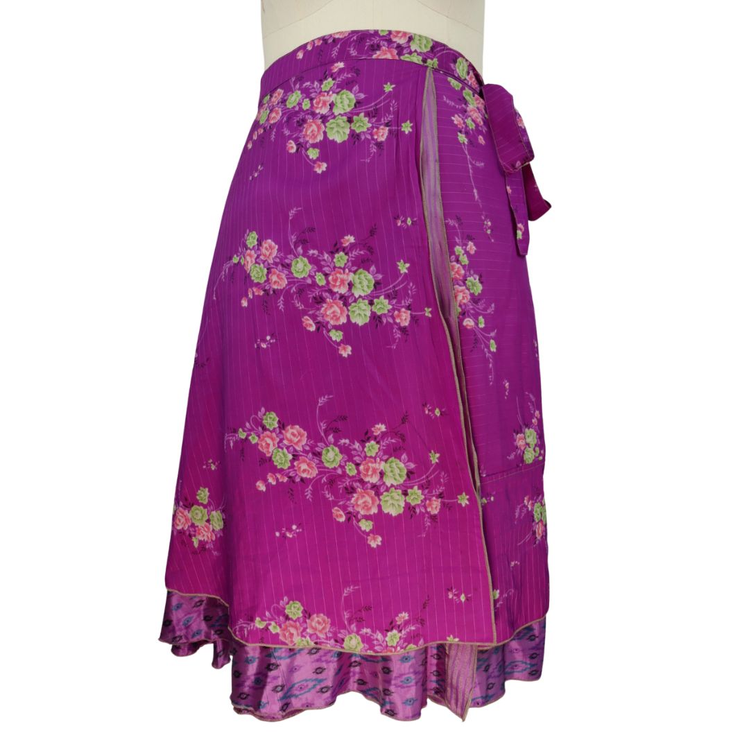Traditionally Saris are often flamboyant and brightly coloured, frequently embroidered, and made from silk, cotton, or, in recent years, synthetic cloth such as viscose and polyester. We use retro Sari cloth in the majority of our garments so silk is a high component. It is not uncommon to find chiffon or georgette added into the mix which is why we refer to the skirts as a silk blend. We also use 'end of roll' sari fabrics.