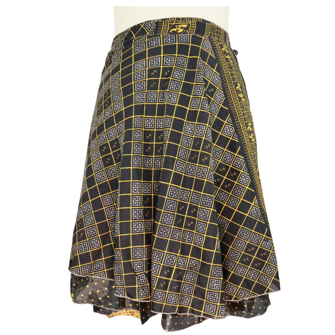 Traditionally Saris are often flamboyant and brightly coloured, frequently embroidered, and made from silk, cotton, or, in recent years, synthetic cloth such as viscose and polyester. We use retro Sari cloth in the majority of our garments so silk is a high component. It is not uncommon to find chiffon or georgette added into the mix which is why we refer to the skirts as a silk blend. We also use 'end of roll' sari fabrics.