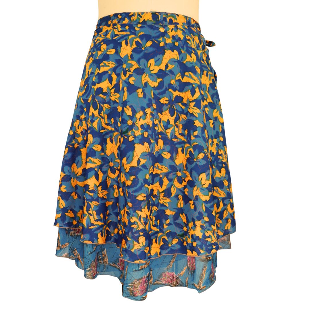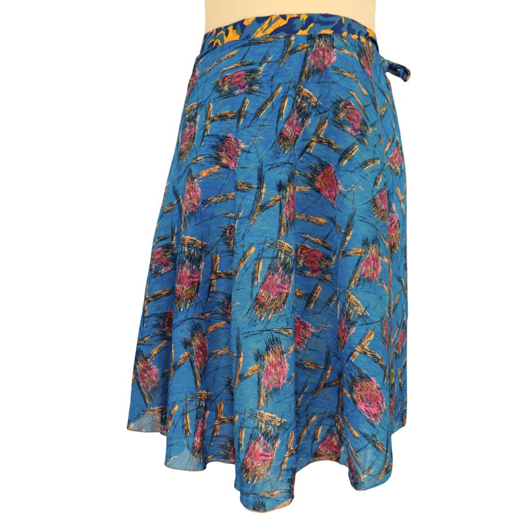 Traditionally Saris are often flamboyant and brightly coloured, frequently embroidered, and made from silk, cotton, or, in recent years, synthetic cloth such as viscose and polyester. We use retro Sari cloth in the majority of our garments so silk is a high component. It is not uncommon to find chiffon or georgette added into the mix which is why we refer to the skirts as a silk blend. We also use 'end of roll' sari fabrics.