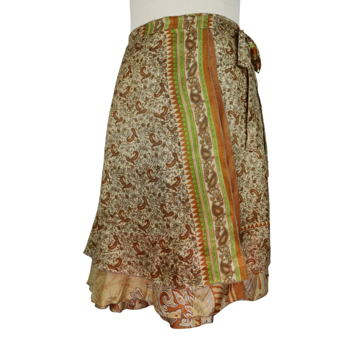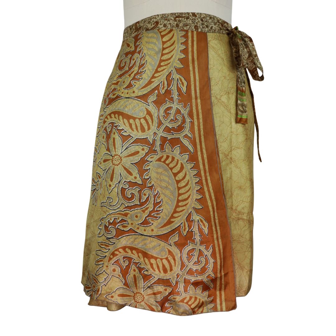 Traditionally Saris are often flamboyant and brightly coloured, frequently embroidered, and made from silk, cotton, or, in recent years, synthetic cloth such as viscose and polyester. We use retro Sari cloth in the majority of our garments so silk is a high component. It is not uncommon to find chiffon or georgette added into the mix which is why we refer to the skirts as a silk blend. We also use 'end of roll' sari fabrics.