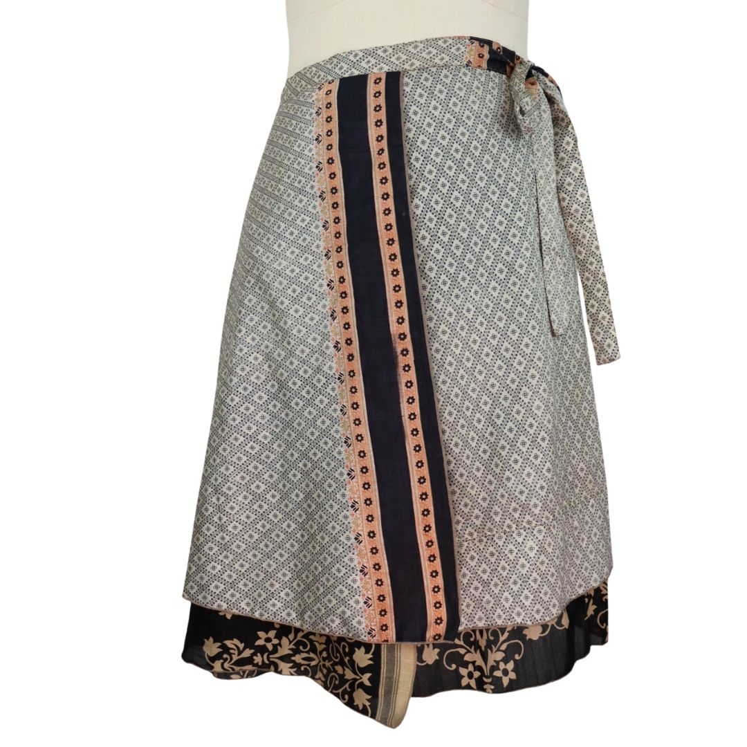 Traditionally Saris are often flamboyant and brightly coloured, frequently embroidered, and made from silk, cotton, or, in recent years, synthetic cloth such as viscose and polyester. We use retro Sari cloth in the majority of our garments so silk is a high component. It is not uncommon to find chiffon or georgette added into the mix which is why we refer to the skirts as a silk blend. We also use 'end of roll' sari fabrics.