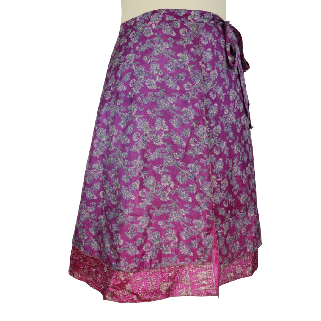 Traditionally Saris are often flamboyant and brightly coloured, frequently embroidered, and made from silk, cotton, or, in recent years, synthetic cloth such as viscose and polyester. We use retro Sari cloth in the majority of our garments so silk is a high component. It is not uncommon to find chiffon or georgette added into the mix which is why we refer to the skirts as a silk blend. We also use 'end of roll' sari fabrics.