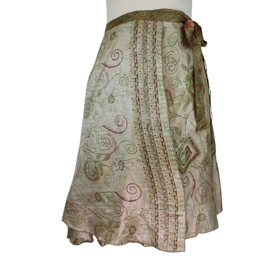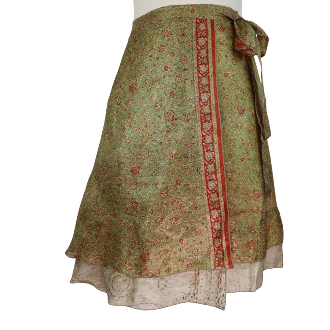 Traditionally Saris are often flamboyant and brightly coloured, frequently embroidered, and made from silk, cotton, or, in recent years, synthetic cloth such as viscose and polyester. We use retro Sari cloth in the majority of our garments so silk is a high component. It is not uncommon to find chiffon or georgette added into the mix which is why we refer to the skirts as a silk blend. We also use 'end of roll' sari fabrics.