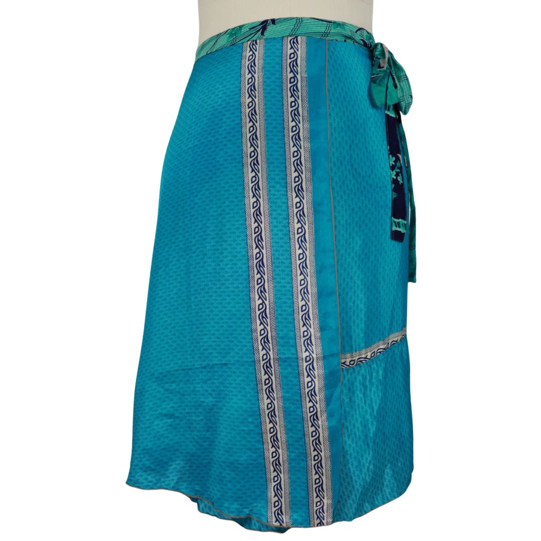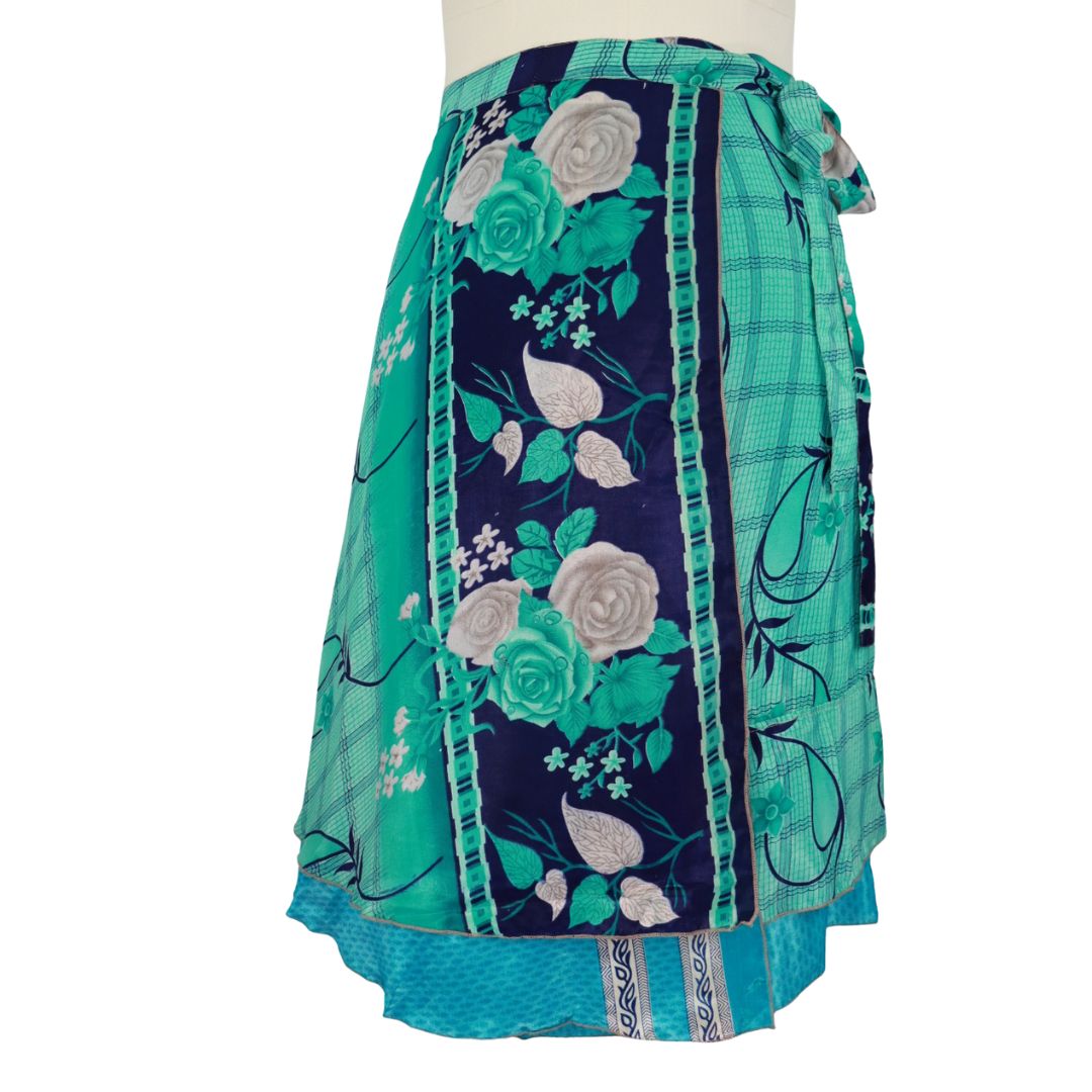 Traditionally Saris are often flamboyant and brightly coloured, frequently embroidered, and made from silk, cotton, or, in recent years, synthetic cloth such as viscose and polyester. We use retro Sari cloth in the majority of our garments so silk is a high component. It is not uncommon to find chiffon or georgette added into the mix which is why we refer to the skirts as a silk blend. We also use 'end of roll' sari fabrics.