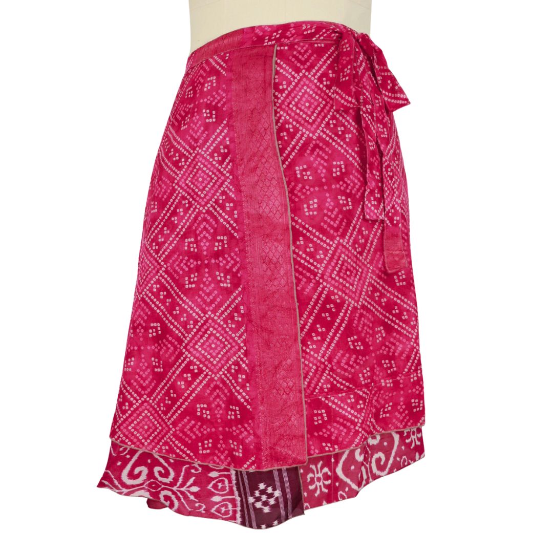 Traditionally Saris are often flamboyant and brightly coloured, frequently embroidered, and made from silk, cotton, or, in recent years, synthetic cloth such as viscose and polyester. We use retro Sari cloth in the majority of our garments so silk is a high component. It is not uncommon to find chiffon or georgette added into the mix which is why we refer to the skirts as a silk blend. We also use 'end of roll' sari fabrics.