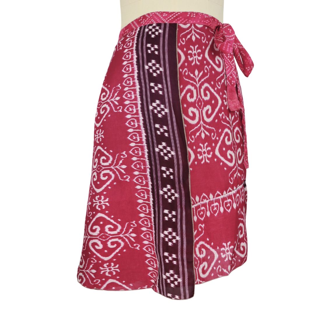 Since the pattern positioning on each skirt varies, you can wrap to either side, the front or back. The tie fastening allows flexibility around the waist and can also be tied to the front, back or side - your choice. The photo shows both sides of the skirt.