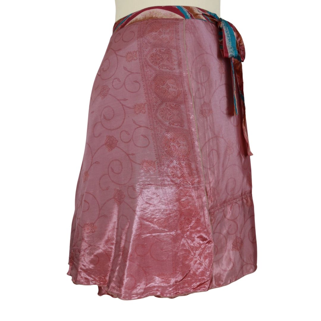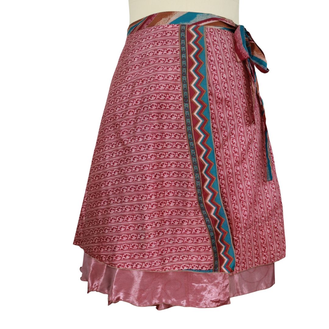 Traditionally Saris are often flamboyant and brightly coloured, frequently embroidered, and made from silk, cotton, or, in recent years, synthetic cloth such as viscose and polyester. We use retro Sari cloth in the majority of our garments so silk is a high component. It is not uncommon to find chiffon or georgette added into the mix which is why we refer to the skirts as a silk blend. We also use 'end of roll' sari fabrics.