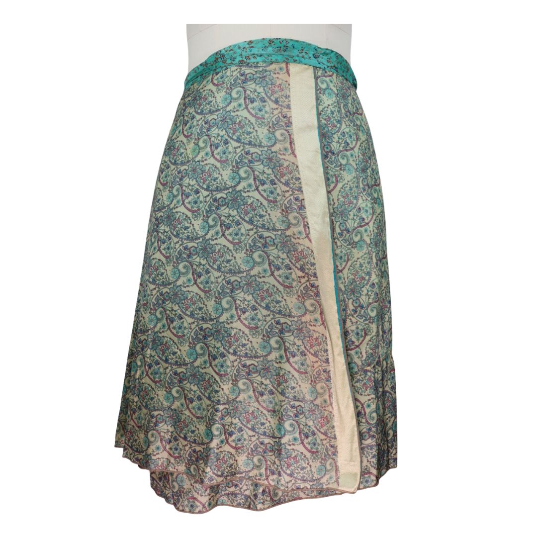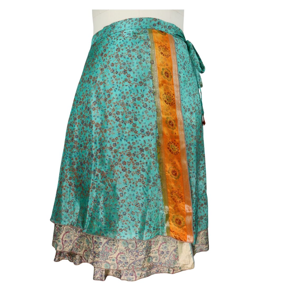 Traditionally Saris are often flamboyant and brightly coloured, frequently embroidered, and made from silk, cotton, or, in recent years, synthetic cloth such as viscose and polyester. We use retro Sari cloth in the majority of our garments so silk is a high component. It is not uncommon to find chiffon or georgette added into the mix which is why we refer to the skirts as a silk blend. We also use 'end of roll' sari fabrics.