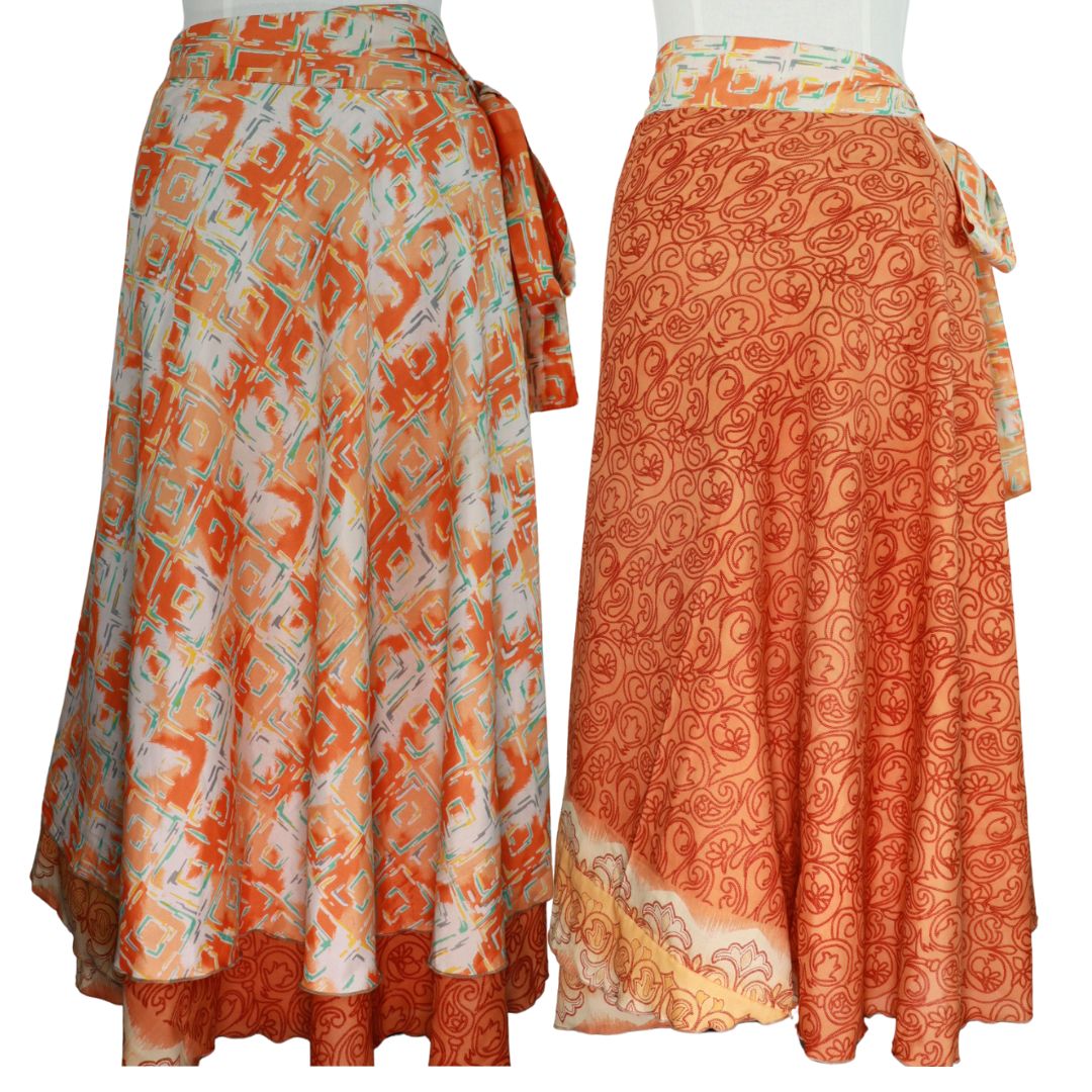 Traditionally Saris are often flamboyant and brightly coloured, frequently embroidered, and made from silk, cotton, or, in recent years, synthetic cloth such as viscose and polyester. We use retro Sari cloth in the majority of our garments so silk is a high component. It is not uncommon to find chiffon or georgette added into the mix which is why we refer to the skirts as a silk blend. We also use 'end of roll' sari fabrics.
