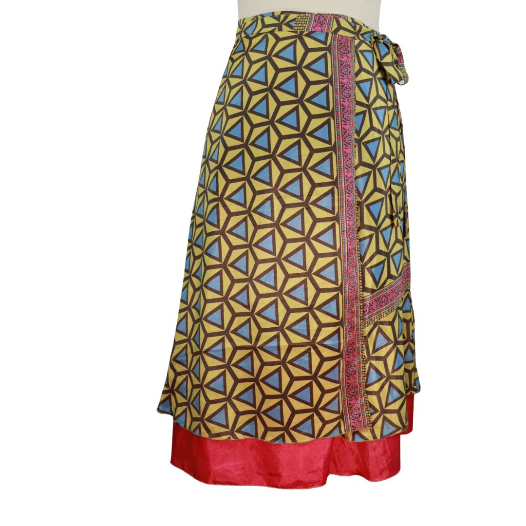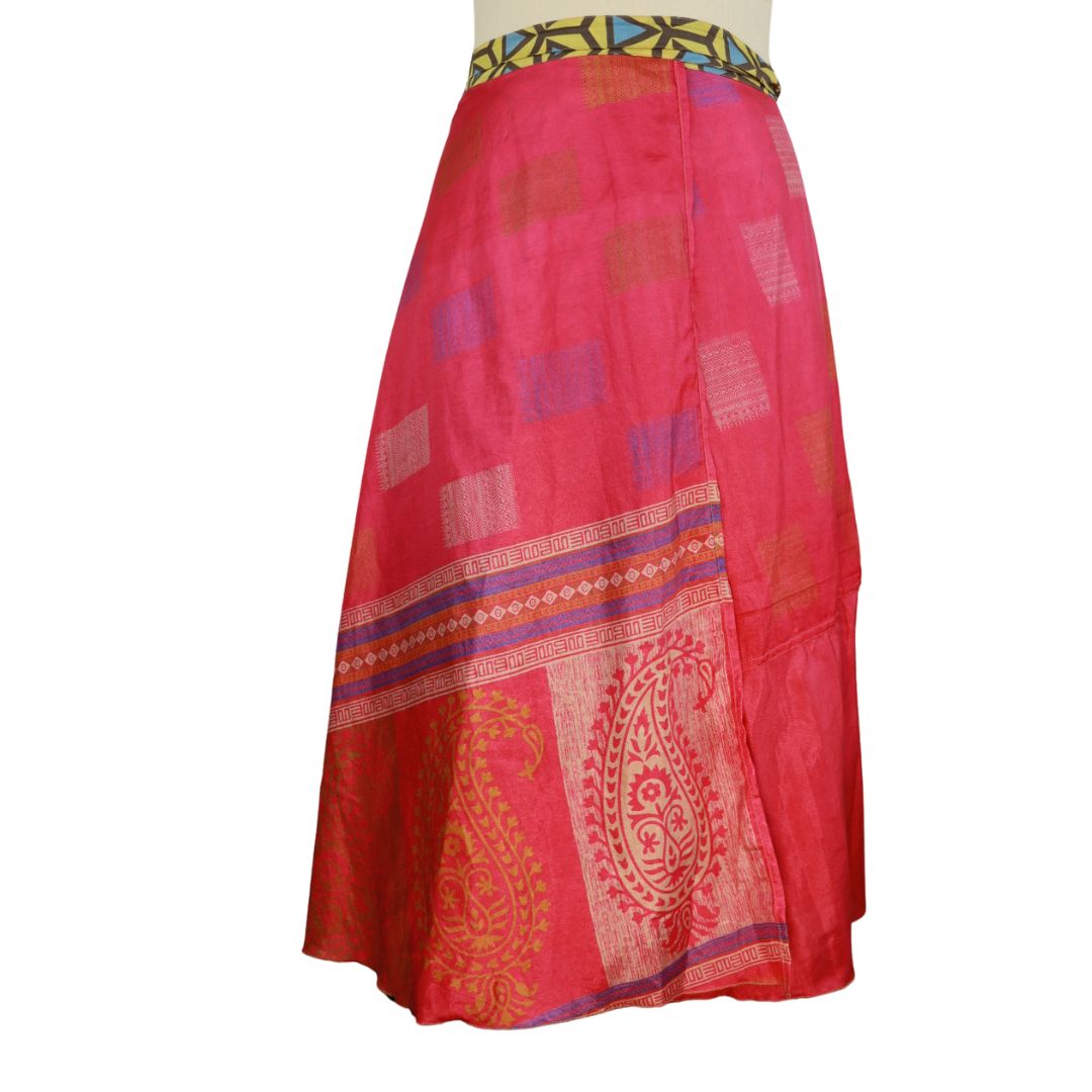 Traditionally Saris are often flamboyant and brightly coloured, frequently embroidered, and made from silk, cotton, or, in recent years, synthetic cloth such as viscose and polyester. We use retro Sari cloth in the majority of our garments so silk is a high component. It is not uncommon to find chiffon or georgette added into the mix which is why we refer to the skirts as a silk blend. We also use 'end of roll' sari fabrics.