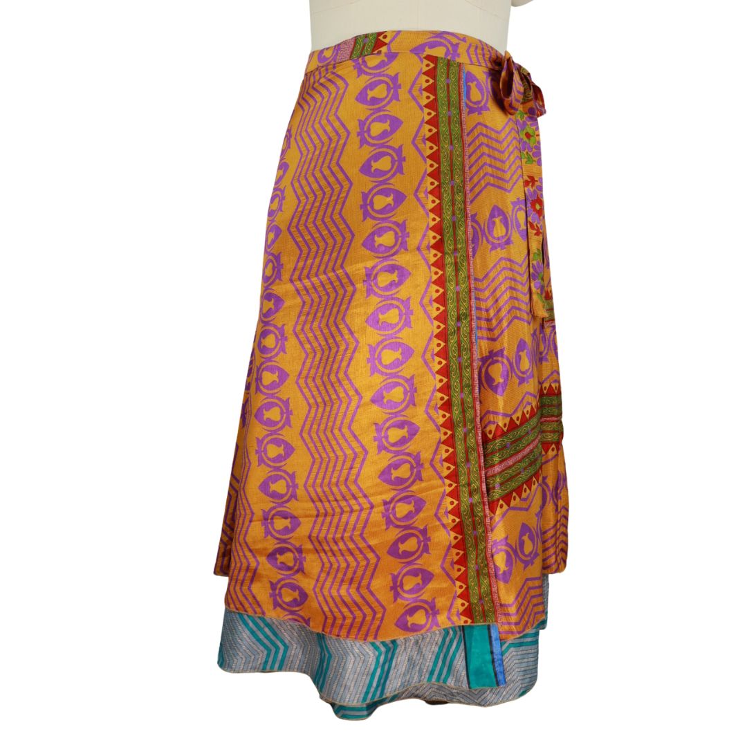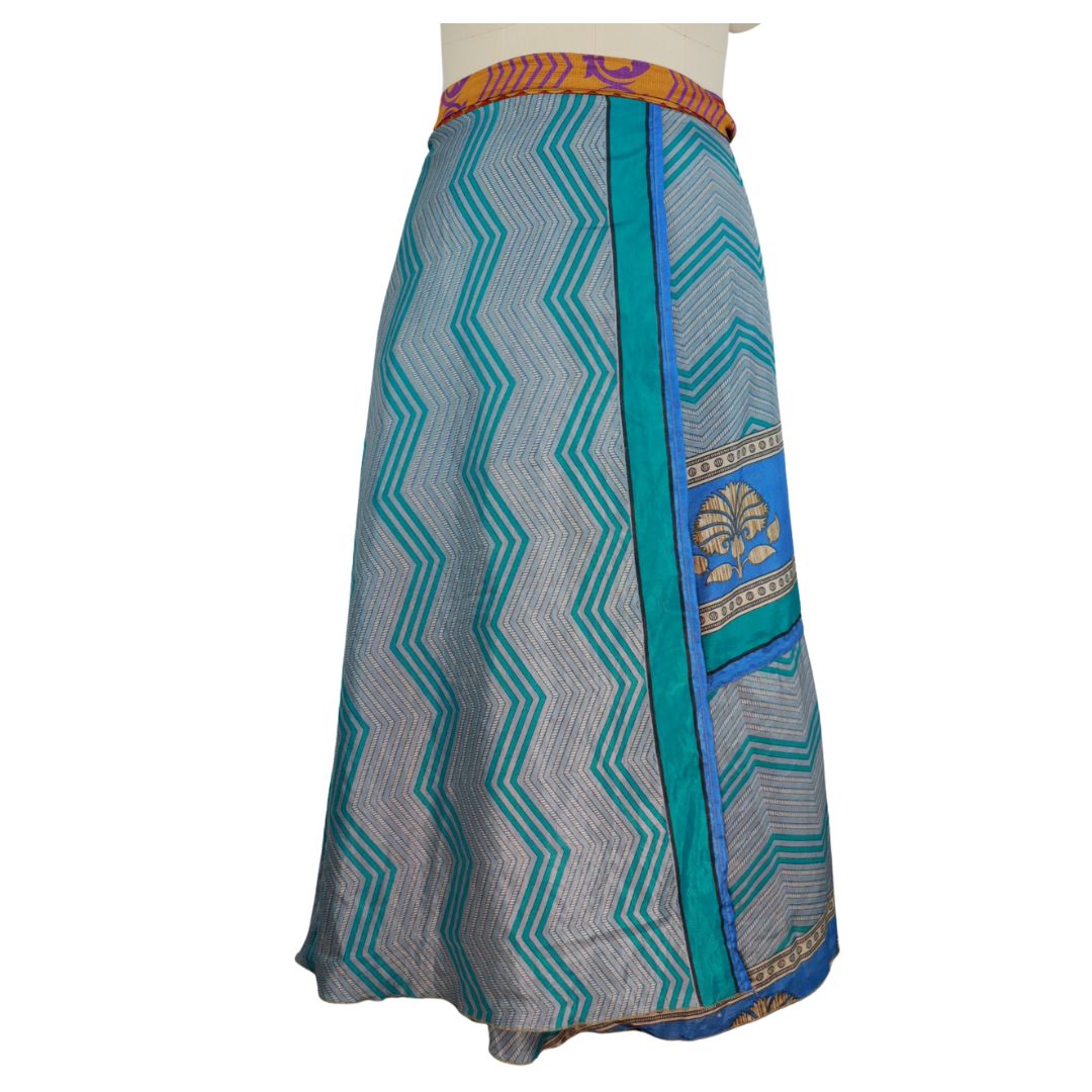 Traditionally Saris are often flamboyant and brightly coloured, frequently embroidered, and made from silk, cotton, or, in recent years, synthetic cloth such as viscose and polyester. We use retro Sari cloth in the majority of our garments so silk is a high component. It is not uncommon to find chiffon or georgette added into the mix which is why we refer to the skirts as a silk blend. We also use 'end of roll' sari fabrics.