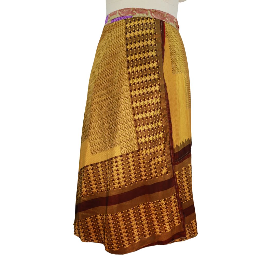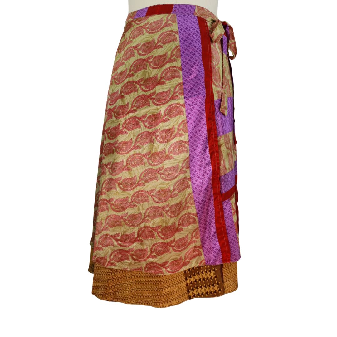 Traditionally Saris are often flamboyant and brightly coloured, frequently embroidered, and made from silk, cotton, or, in recent years, synthetic cloth such as viscose and polyester. We use retro Sari cloth in the majority of our garments so silk is a high component. It is not uncommon to find chiffon or georgette added into the mix which is why we refer to the skirts as a silk blend. We also use 'end of roll' sari fabrics.