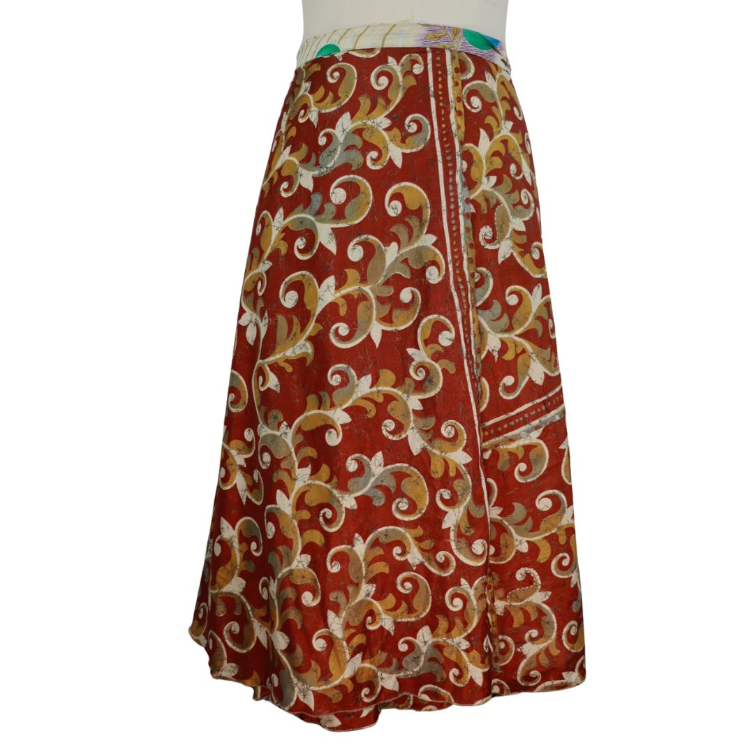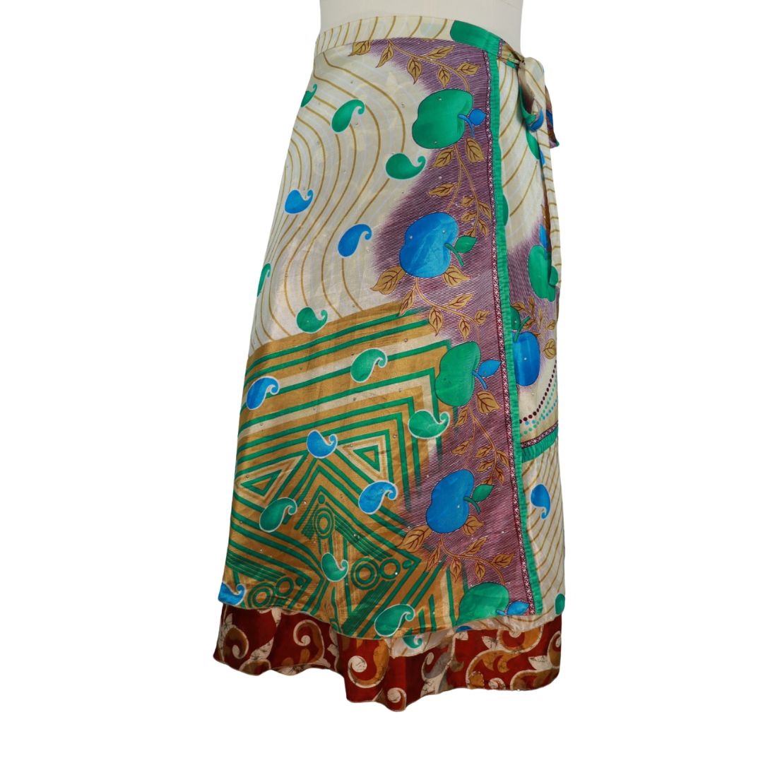 Traditionally Saris are often flamboyant and brightly coloured, frequently embroidered, and made from silk, cotton, or, in recent years, synthetic cloth such as viscose and polyester. We use retro Sari cloth in the majority of our garments so silk is a high component. It is not uncommon to find chiffon or georgette added into the mix which is why we refer to the skirts as a silk blend. We also use 'end of roll' sari fabrics.