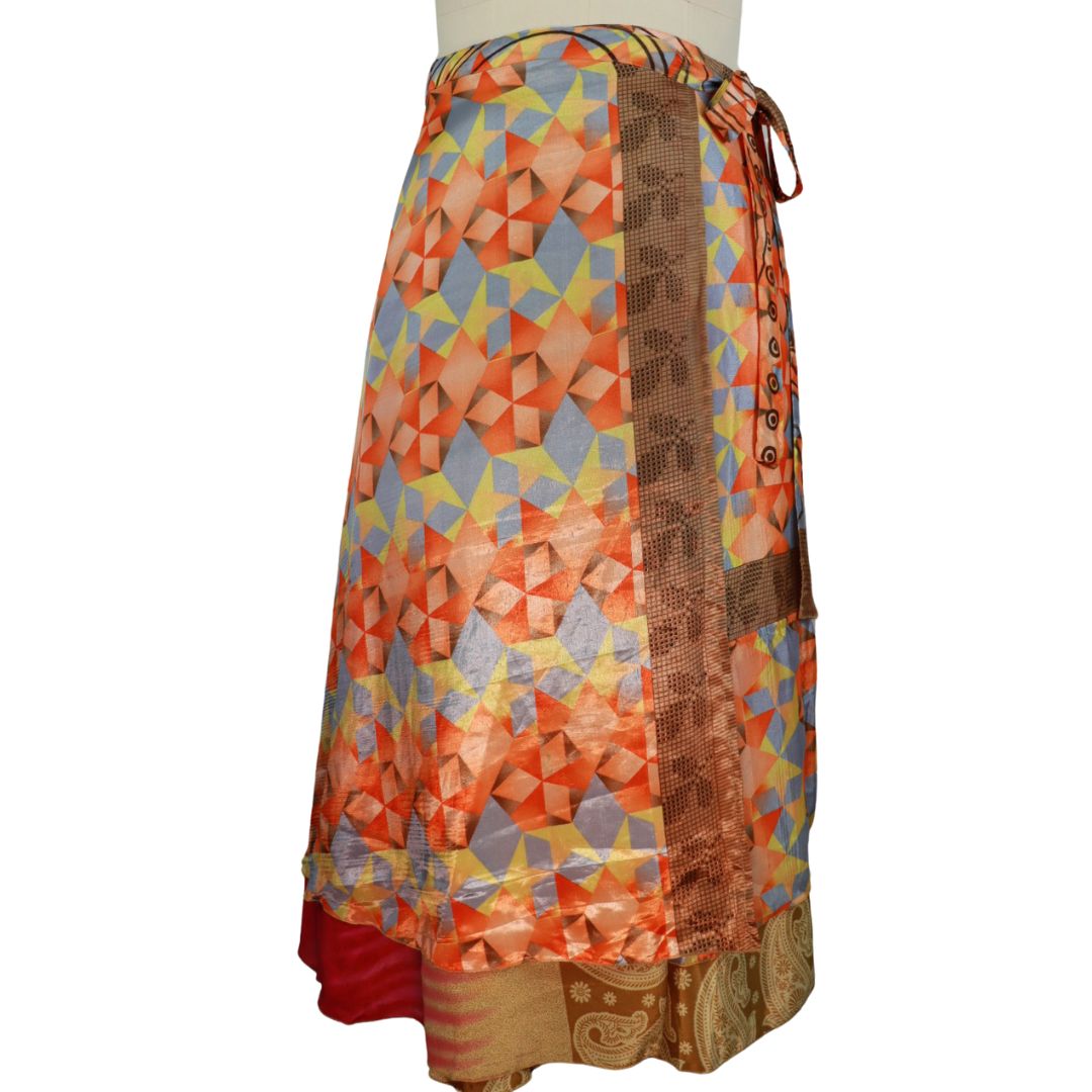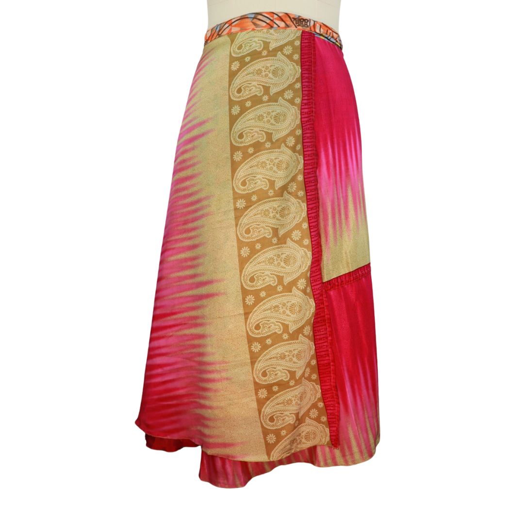 Traditionally Saris are often flamboyant and brightly coloured, frequently embroidered, and made from silk, cotton, or, in recent years, synthetic cloth such as viscose and polyester. We use retro Sari cloth in the majority of our garments so silk is a high component. It is not uncommon to find chiffon or georgette added into the mix which is why we refer to the skirts as a silk blend. We also use 'end of roll' sari fabrics.