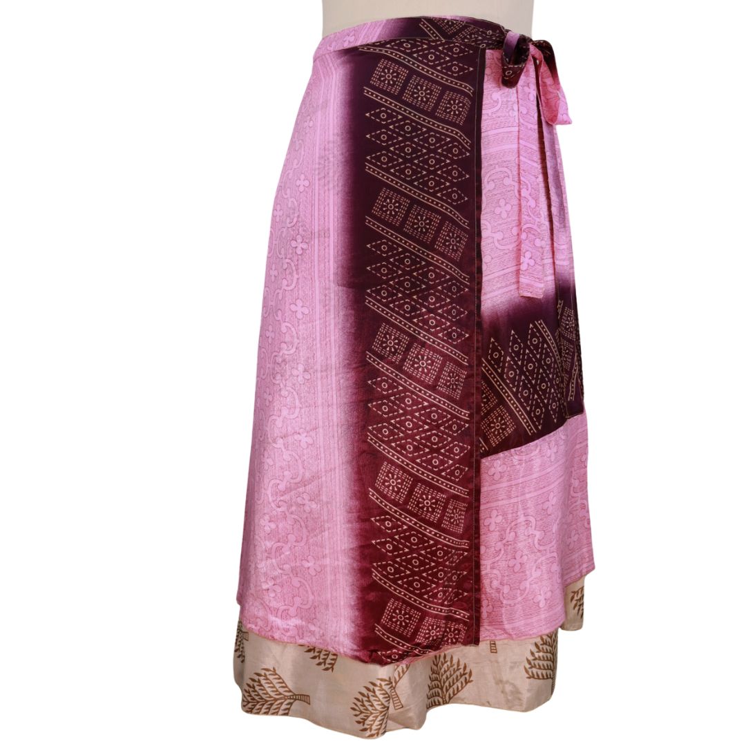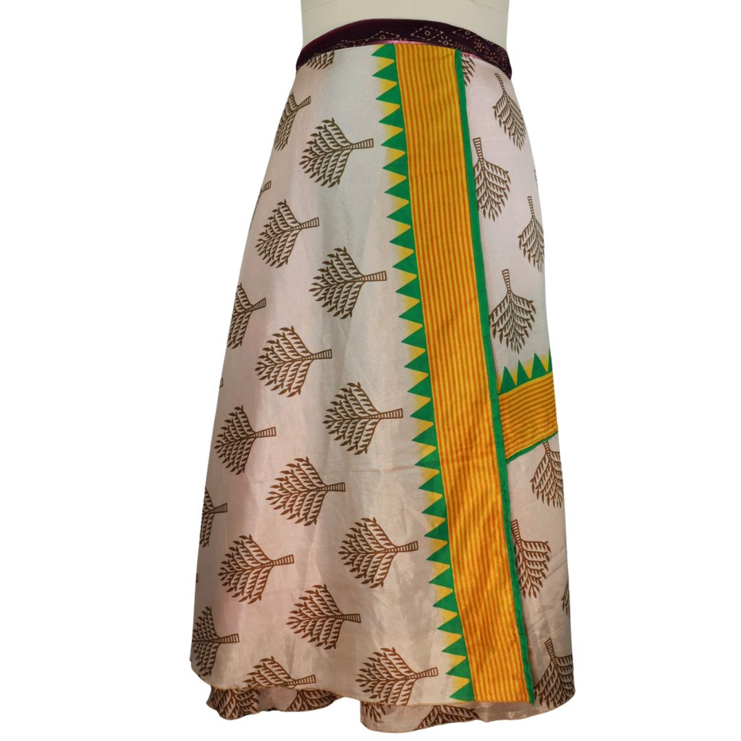 Traditionally Saris are often flamboyant and brightly coloured, frequently embroidered, and made from silk, cotton, or, in recent years, synthetic cloth such as viscose and polyester. We use retro Sari cloth in the majority of our garments so silk is a high component. It is not uncommon to find chiffon or georgette added into the mix which is why we refer to the skirts as a silk blend. We also use 'end of roll' sari fabrics.