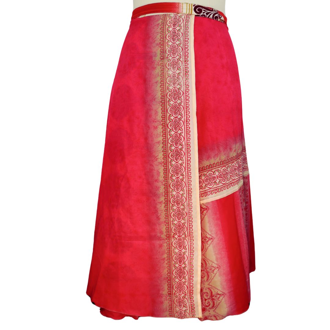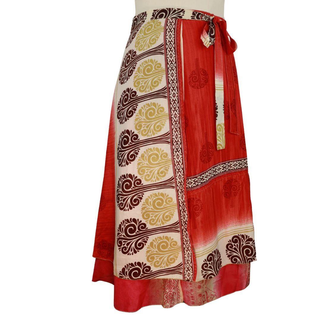 Traditionally Saris are often flamboyant and brightly coloured, frequently embroidered, and made from silk, cotton, or, in recent years, synthetic cloth such as viscose and polyester. We use retro Sari cloth in the majority of our garments so silk is a high component. It is not uncommon to find chiffon or georgette added into the mix which is why we refer to the skirts as a silk blend. We also use 'end of roll' sari fabrics.