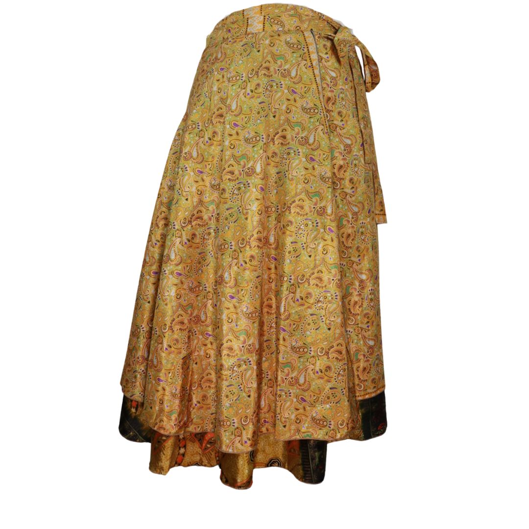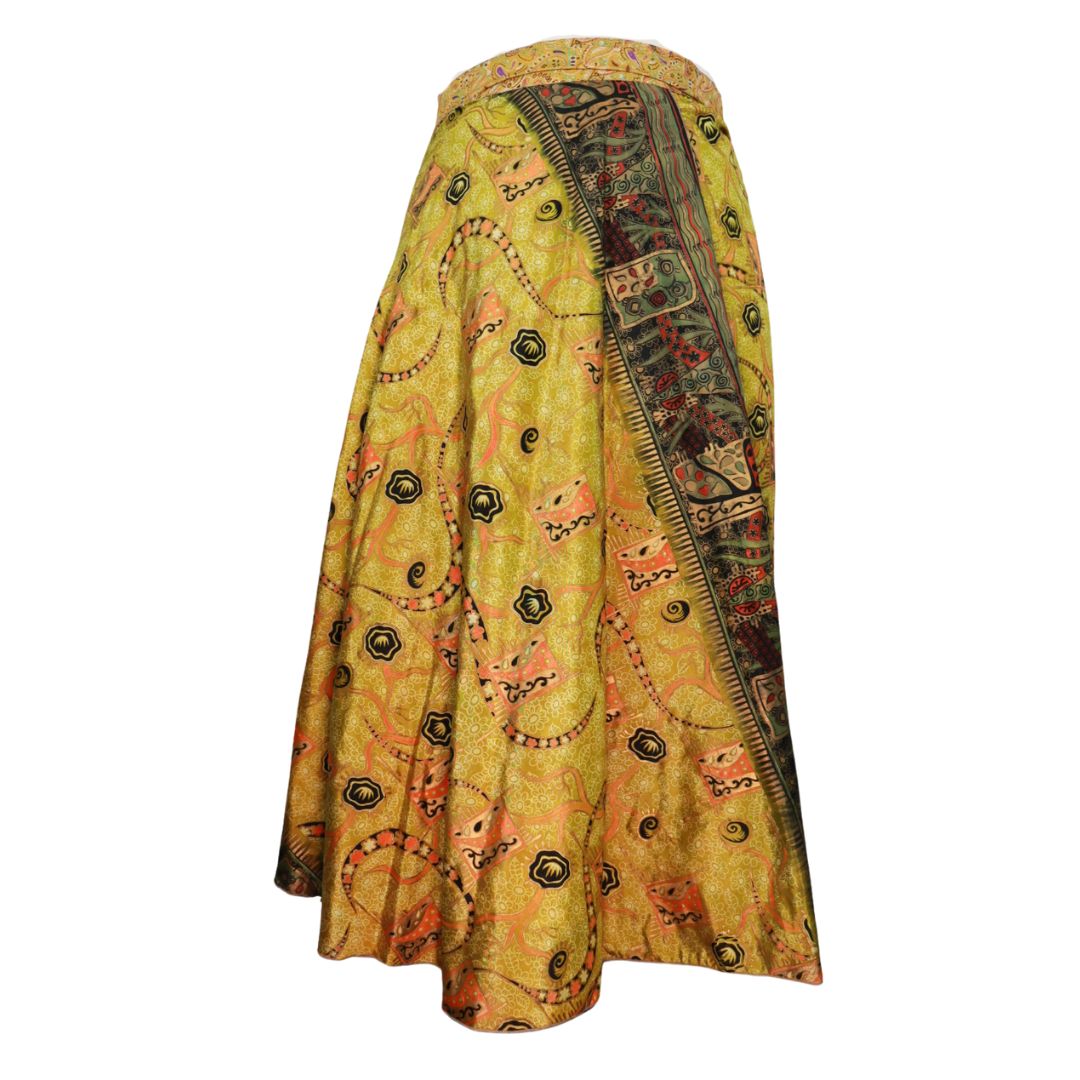 Traditionally Saris are often flamboyant and brightly coloured, frequently embroidered, and made from silk, cotton, or, in recent years, synthetic cloth such as viscose and polyester. We use retro Sari cloth in the majority of our garments so silk is a high component. It is not uncommon to find chiffon or georgette added into the mix which is why we refer to the skirts as a silk blend. We also use 'end of roll' sari fabrics.